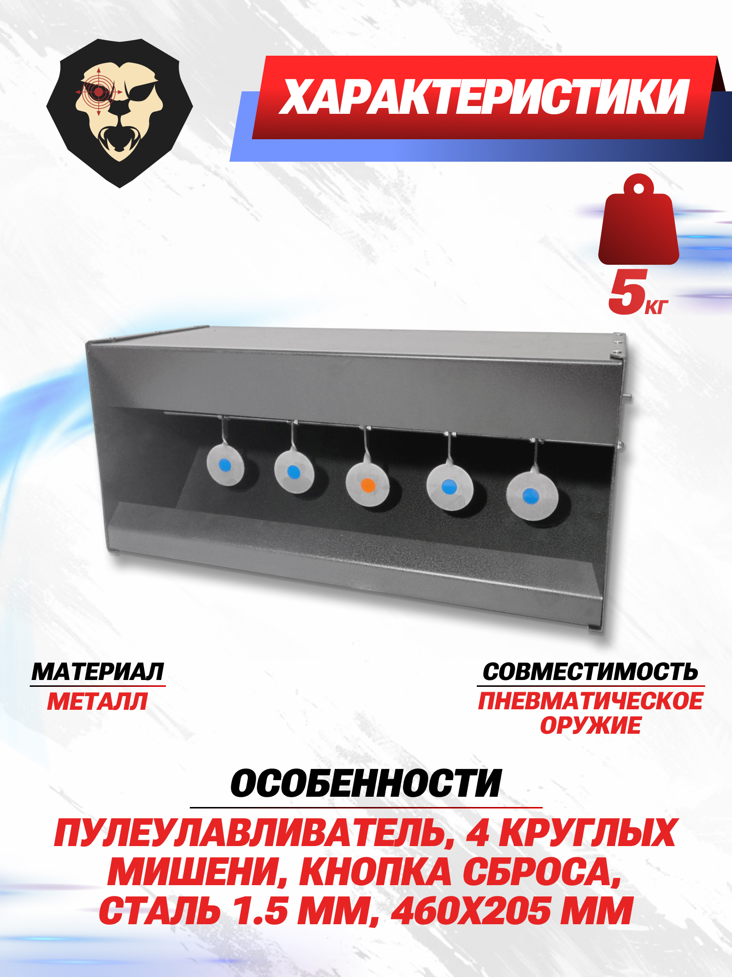 | Особенности | Пулеулавливатель, 4 круглых мишени, кнопка сброса, сталь 1.5 мм, 460x205 мм |