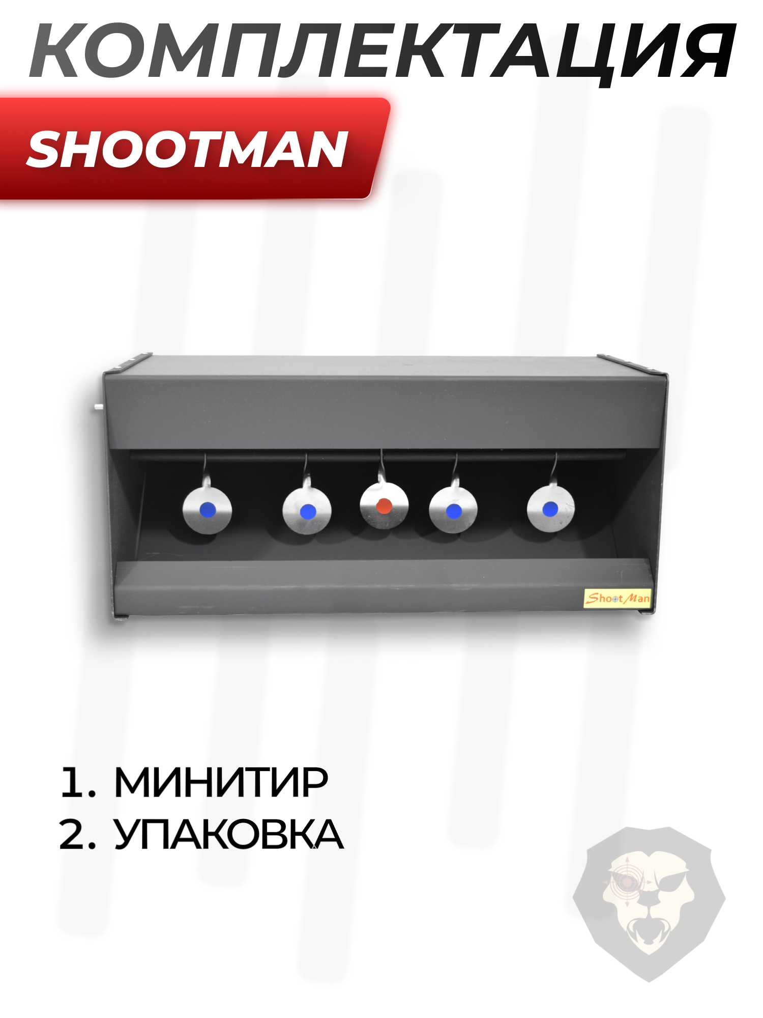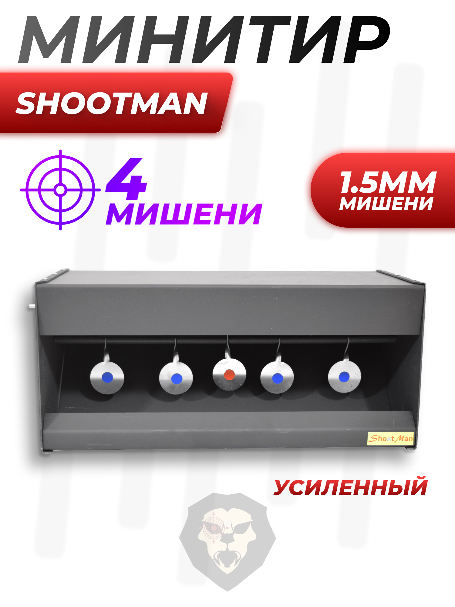 Мини тир Shootman для пневматики выпускается одноименной российской компанией, специализирующейся на изготовлении оборудования для стрельбищ. Усиленная модель «биатлон» выполнена в виде короба, с толщиной листовой стали 0.2 см. Задняя стенка корпуса имеет изгиб, в результате чего попавшие внутрь снаряды не рикошетят в сторону, исключая порчу домашних предметов мебели.