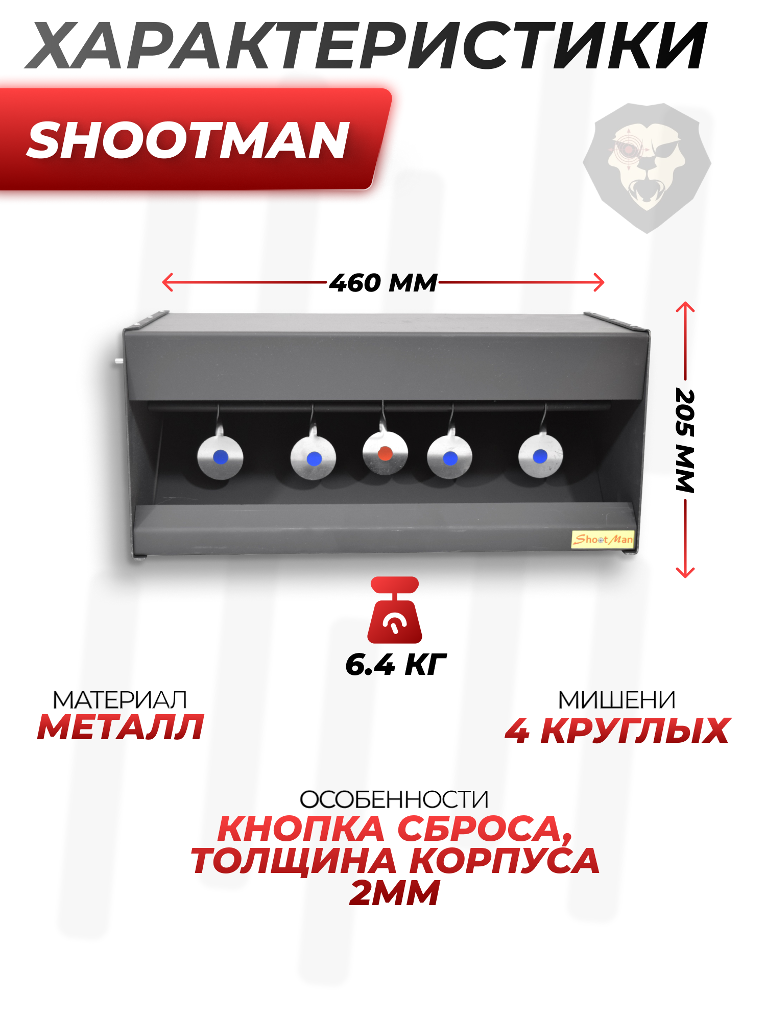 Особенности | Пулеулавливатель, 4 круглых мишени, кнопка сброса, толщина корпуса 2 мм, мишени 1.5 мм, 460x205 мм |