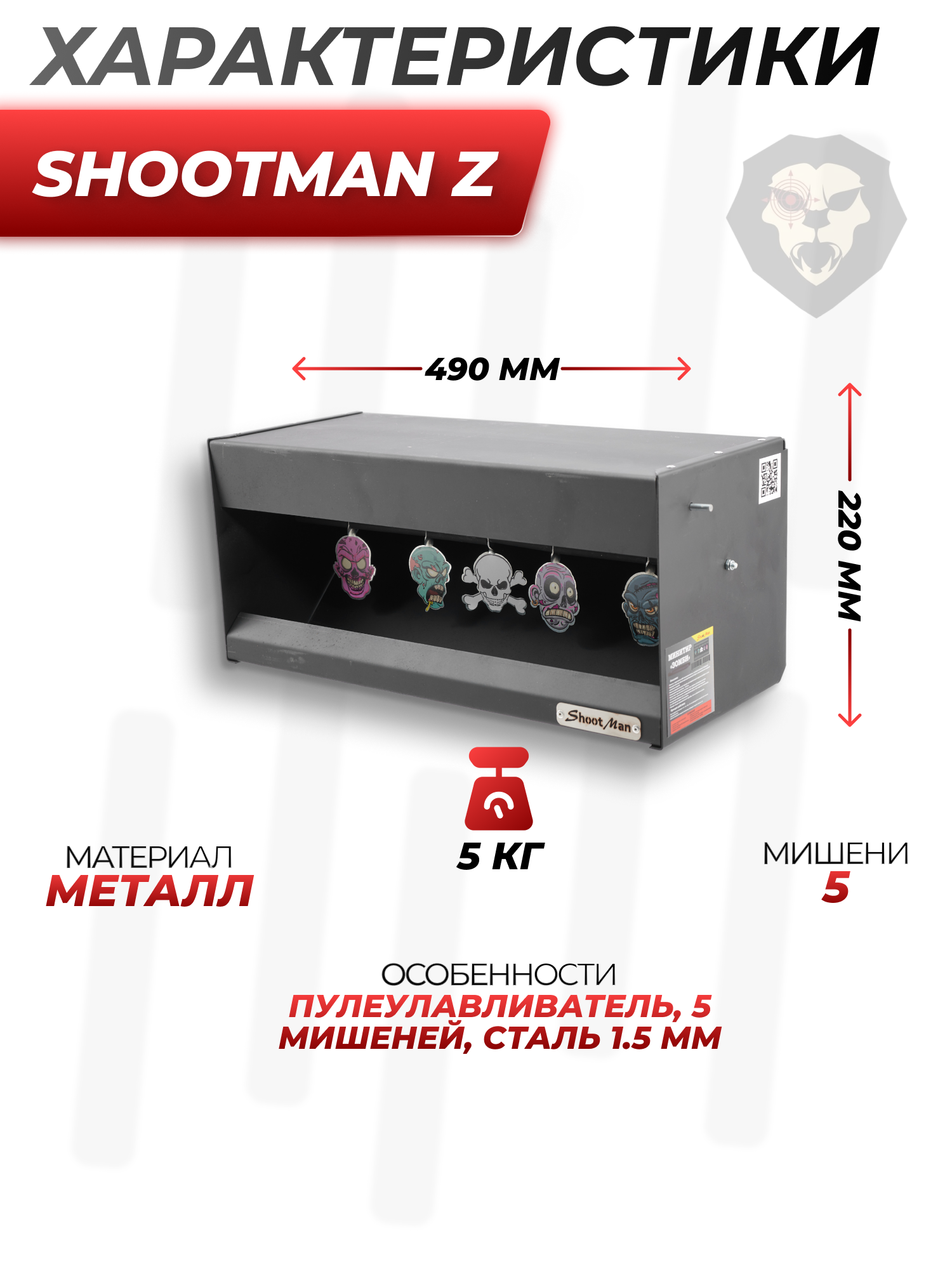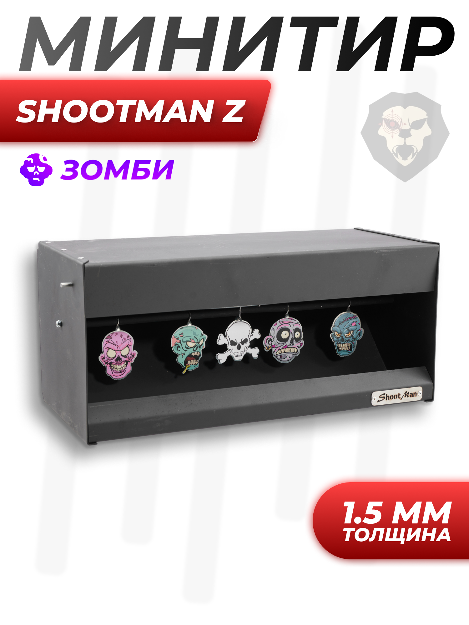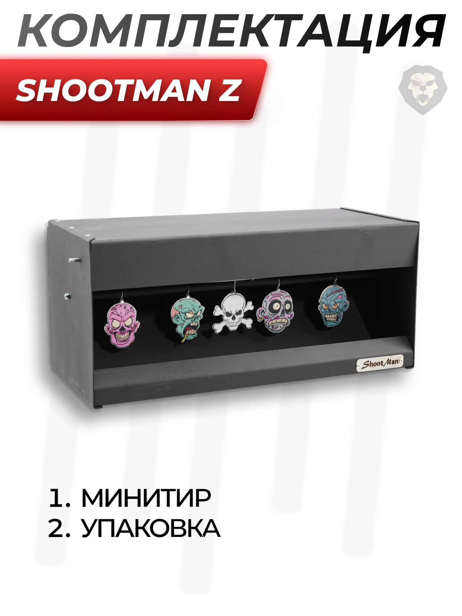 Минитир Шутман Z предназначен для прицельной стрельбы из любых типов пневматики калибром 4.5 мм. Модель состоит из пяти металлических мишеней в форме зомби толщиной 1.5 мм и пулеулавливателя размером 450x205 мм.