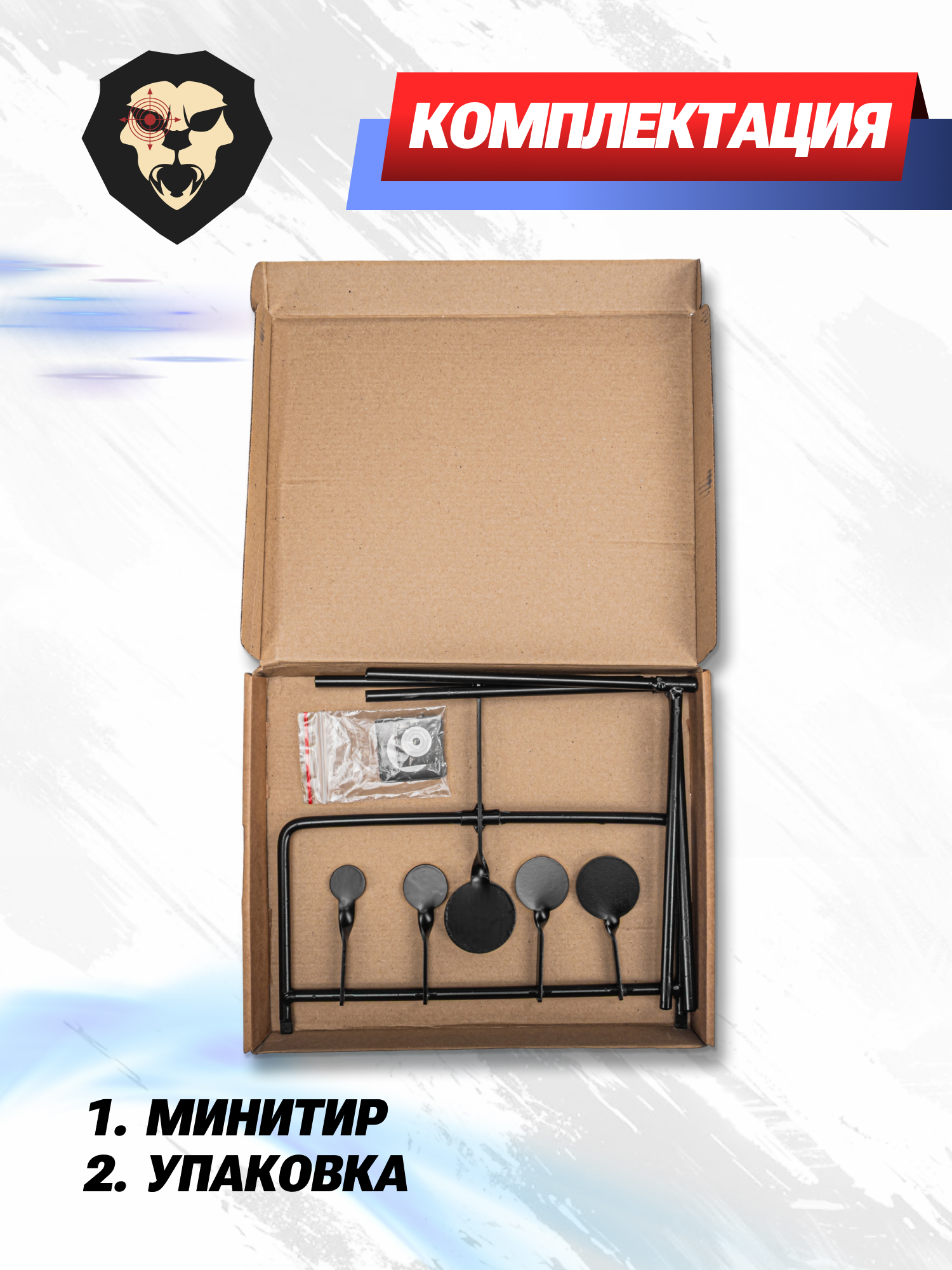 Минитир для пневматики изготавливается из металла, окрашенного в черный цвет - мишени для контраста снабжаются белыми наклейками с точкой по центру. Трубчатый каркас без труда разбирается, что упрощает хранение и транспортировку. В рабочем состоянии его размер составляет 27x30x34 см.