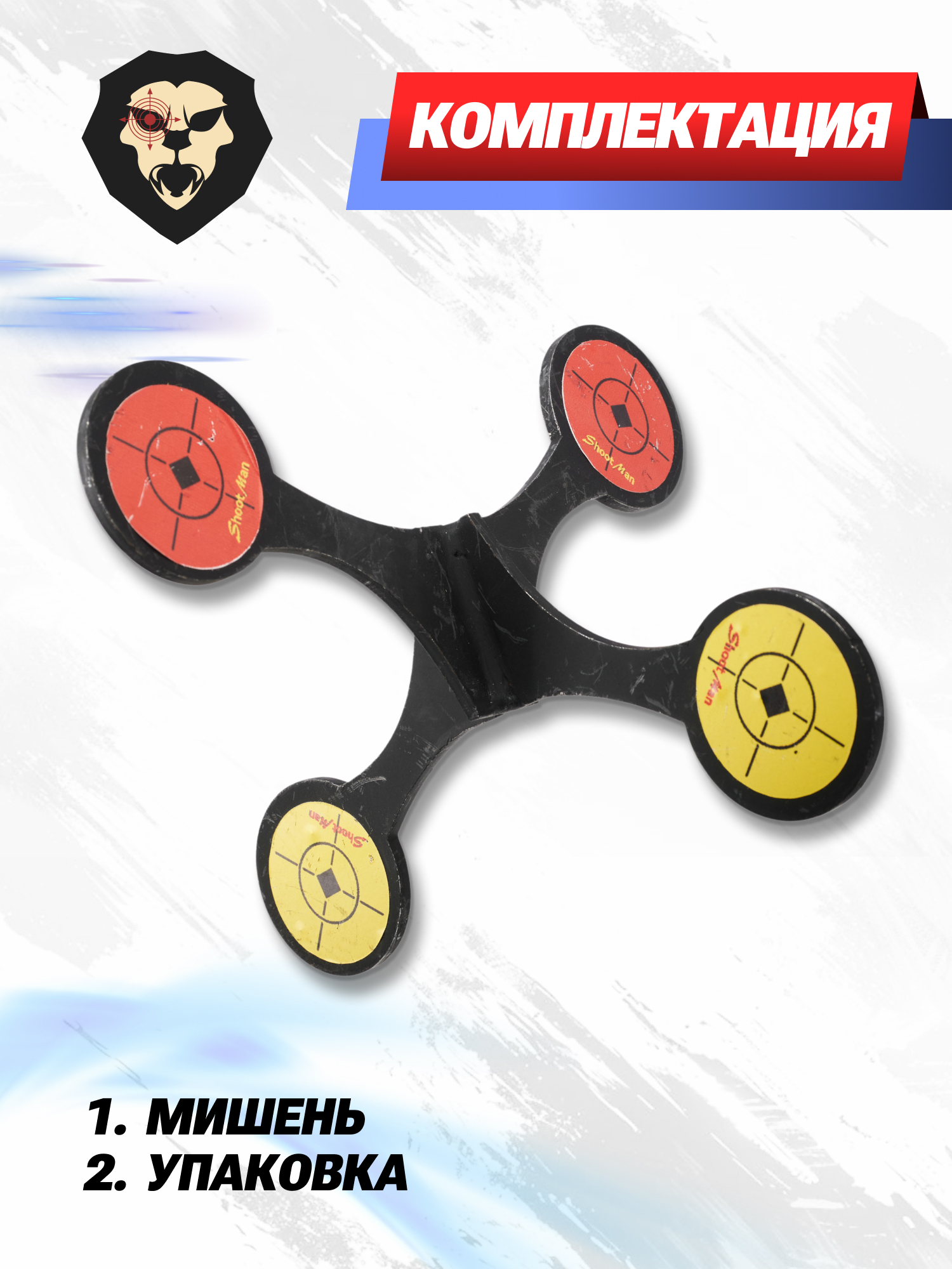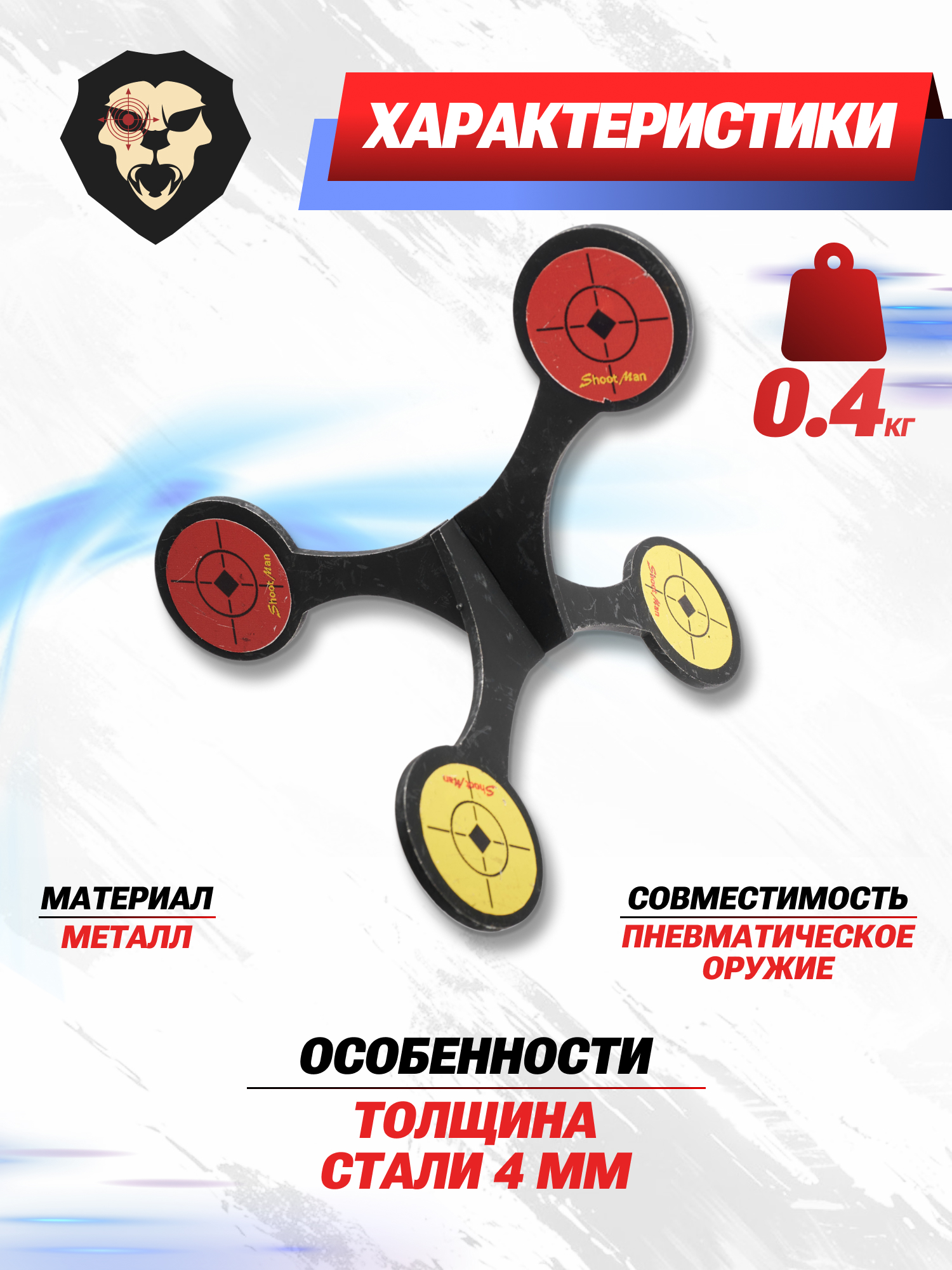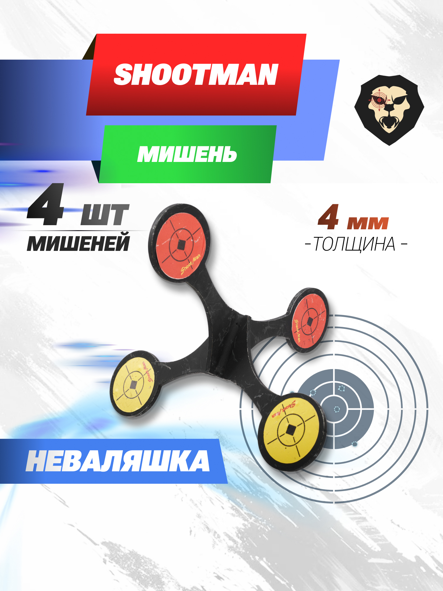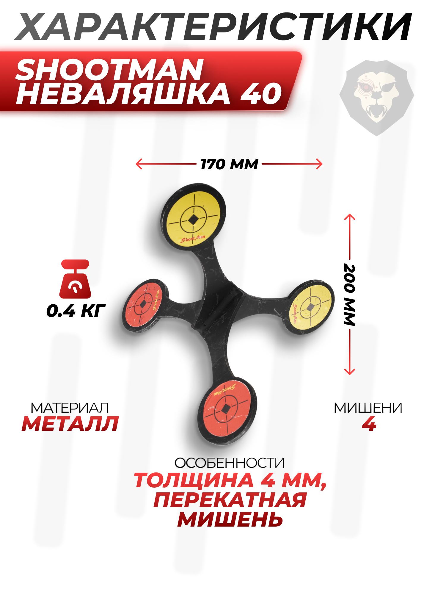 Перекатная мишень Shootman станет отличным выбором как для новичков, так и опытных владельцев пневматики. Цель высотой 40 см характеризуется скрещенной неразборной конструкцией, состоящей из 4 лопастей с плоскими дисками на концах. Изделие не нуждается в обслуживании и предназначается для непрерывной темповой стрельбы, так как при поражении верхнего гонга каркас переворачивается по принципу неваляшки.