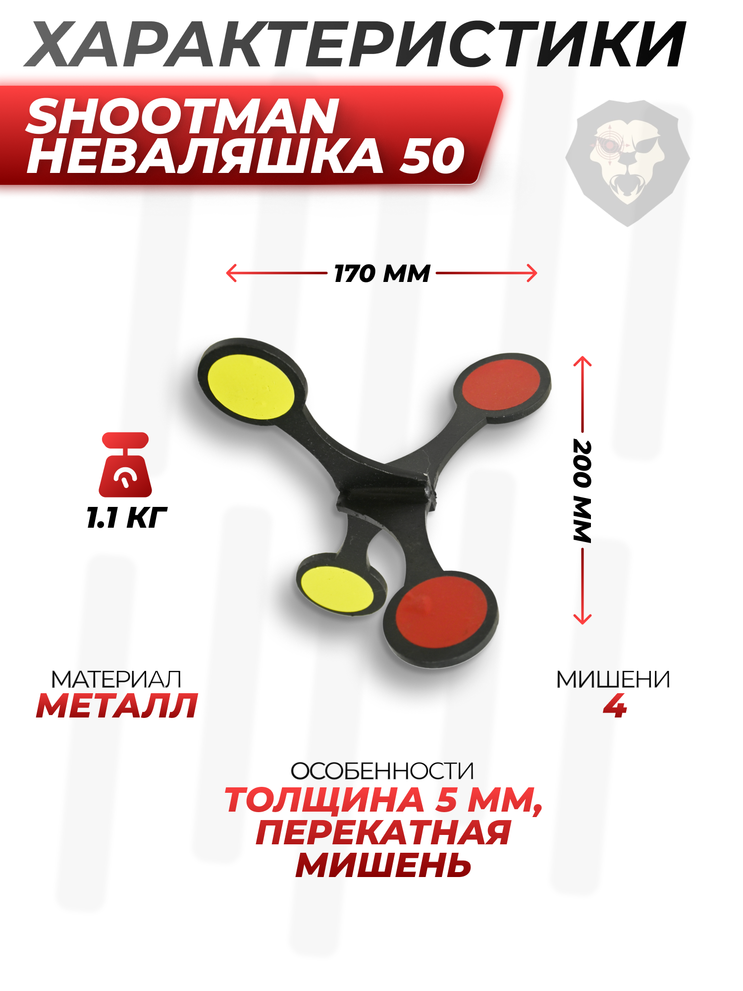 Информация о товаре "Мишень перекатная Shootman Неваляшка 50 (5 мм)" носит ознакомительный характер, и не является публичной офертой, определяемой положениями Статьи 437 Гражданского кодекса Российской Федерации, характеристики, внешний вид, цвет и комплектация могут быть изменены производителем без уведомления.