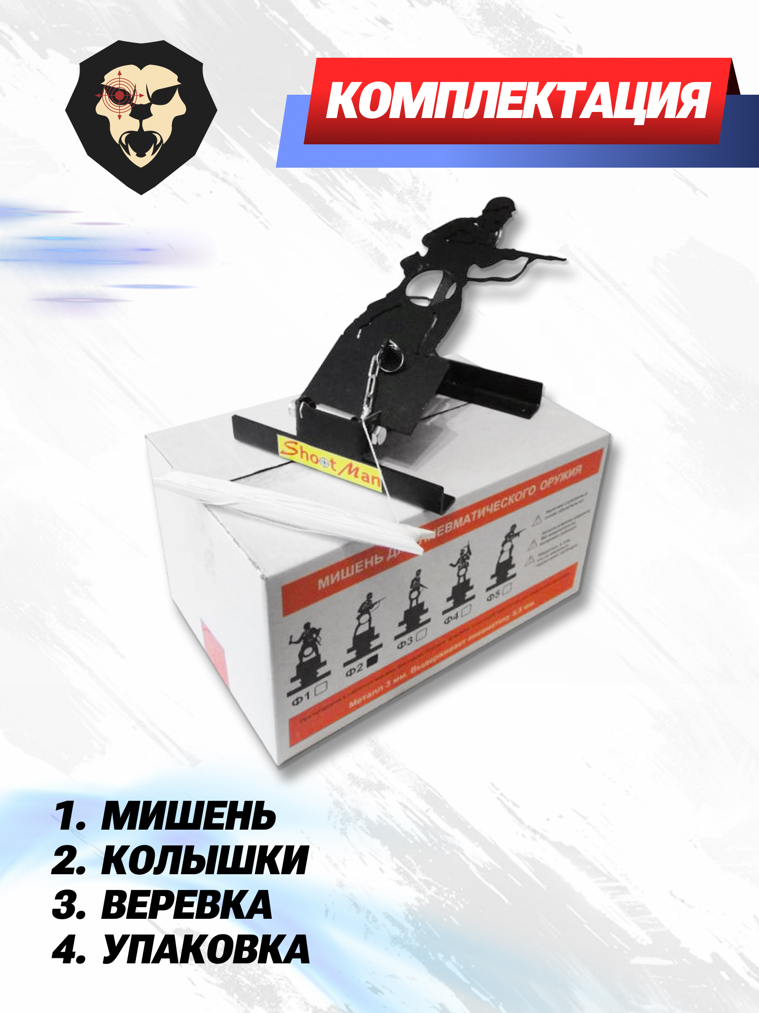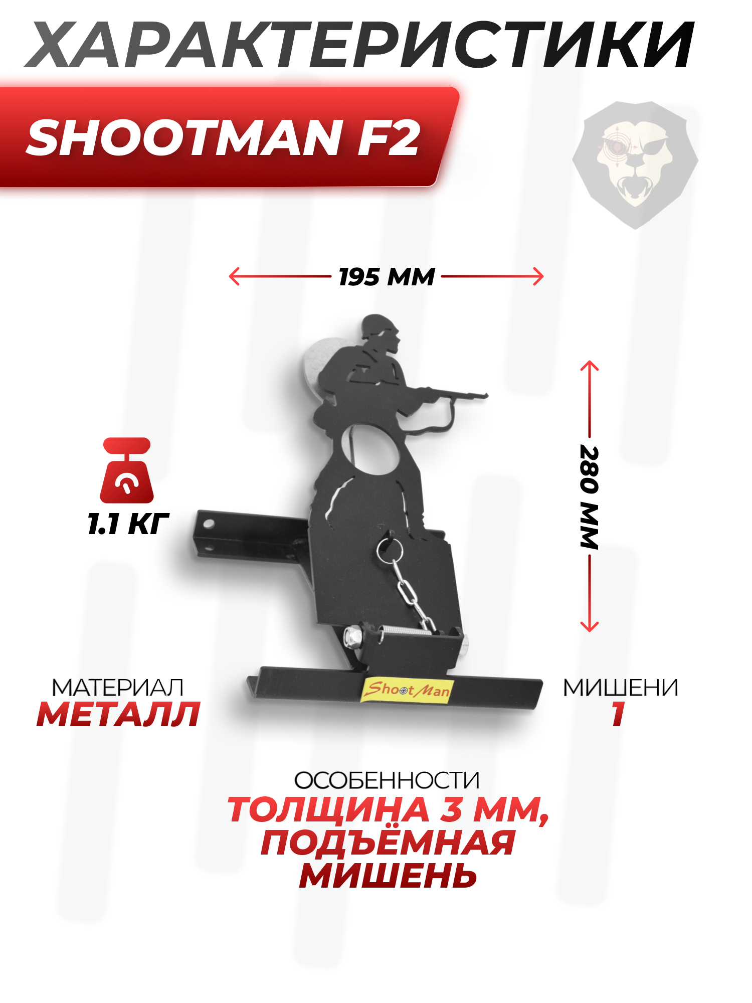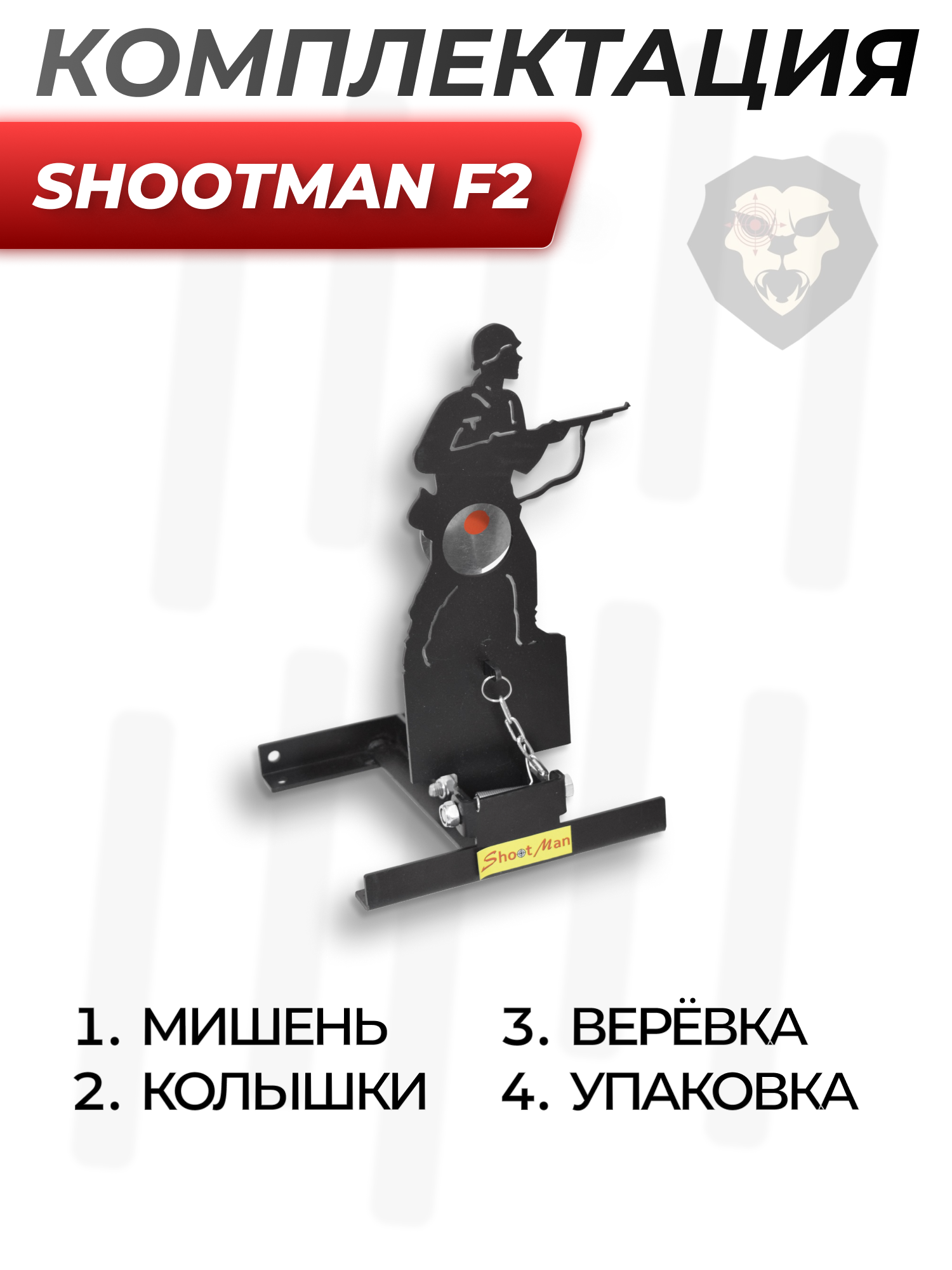 Подъемная мишень Шутман Ф4 имеет силуэт солдата Вермахта, целящегося из винтовки. Фигура изготавливается из металлического листа толщиной 3 миллиметра и установливается на уголковые направляющие из прокатной стали. Образец можно разместить как на твердую поверхность, так и на грунт с помощью колышек, которые присутствуют в поставляемом комплекте.