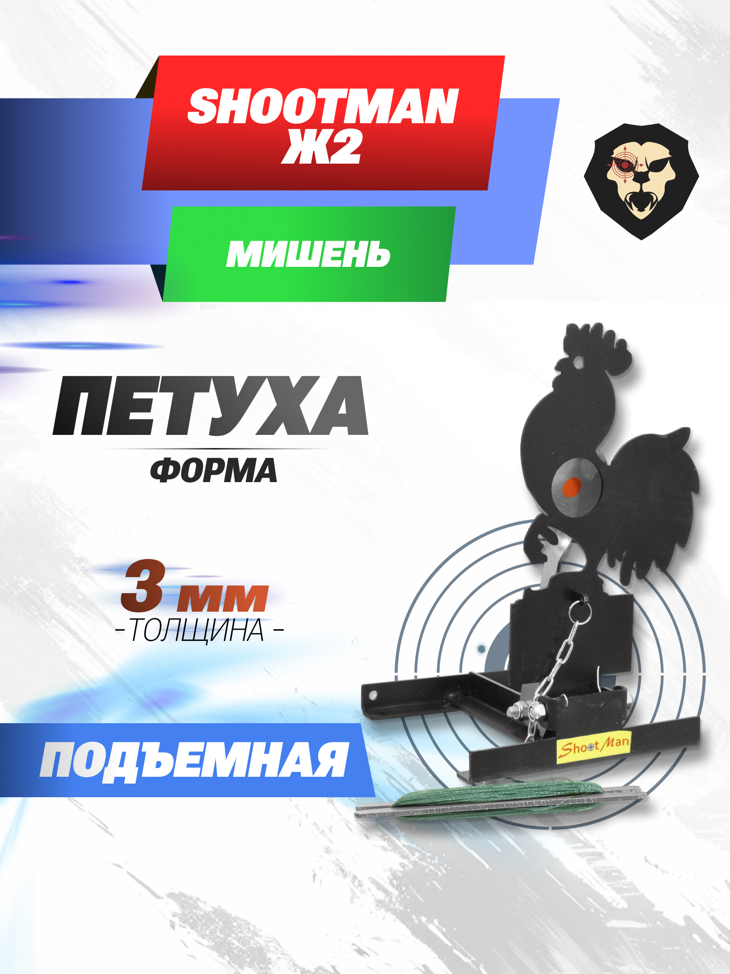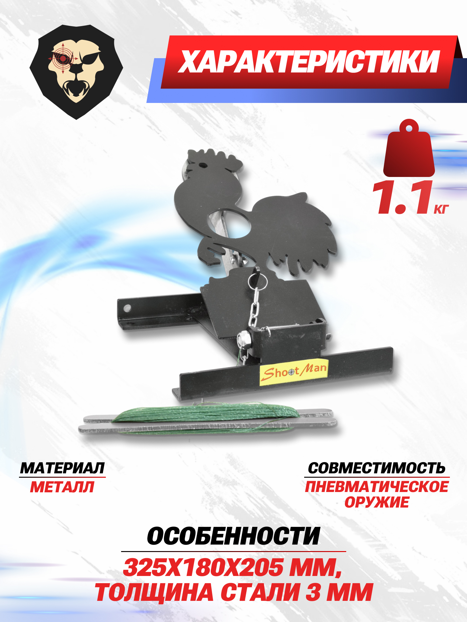 Обозреваемая подъемная мишень Shootman изготавливается одноименной российской фирмой и представляет собой силуэт петушка размером 325x180x205 мм. Цель окрашена проникающим в структуру металла противоударным составом черного цвета, который защищает поверхность от возникновения ржавчины и продлевает срок эксплуатации.