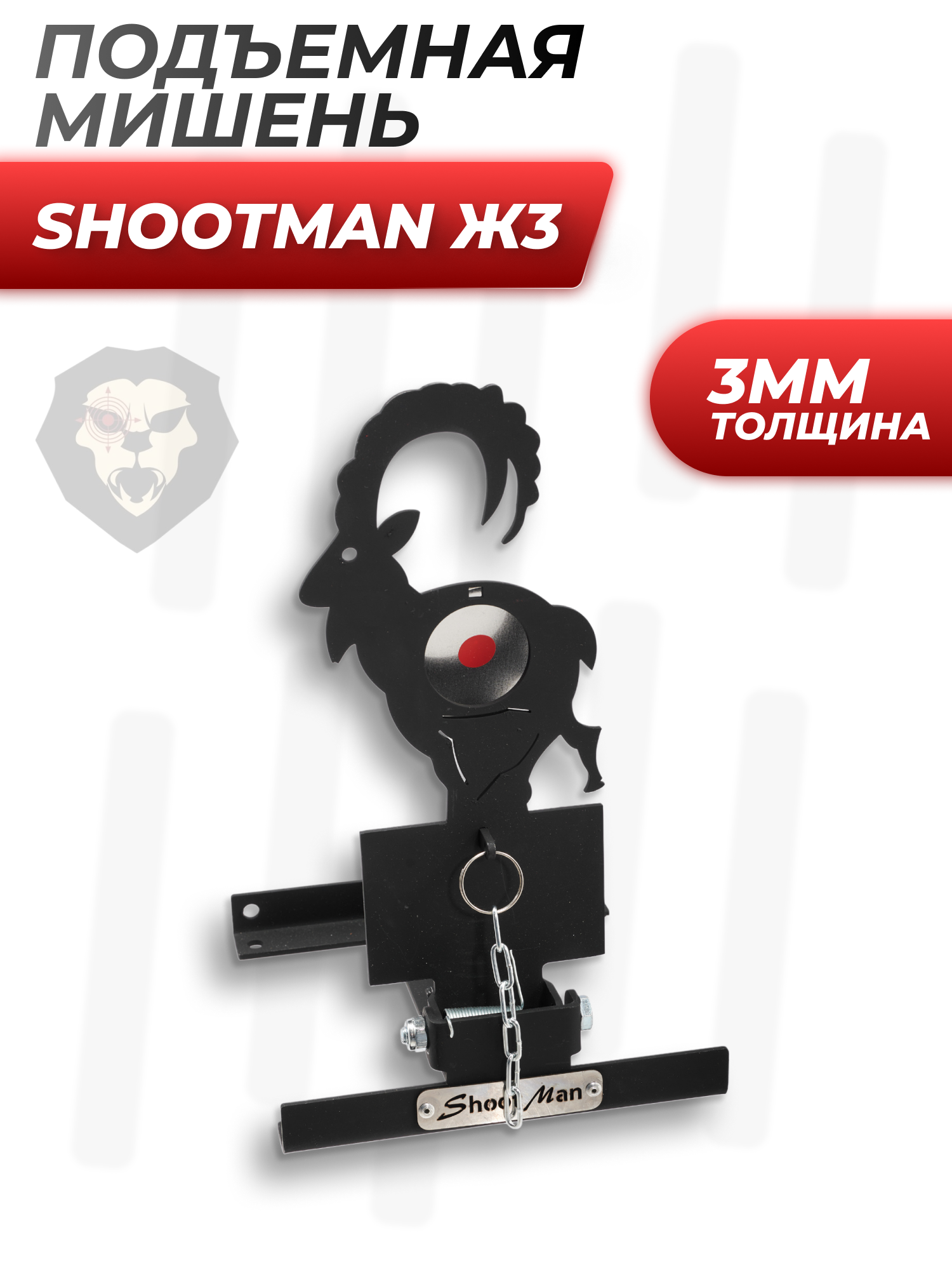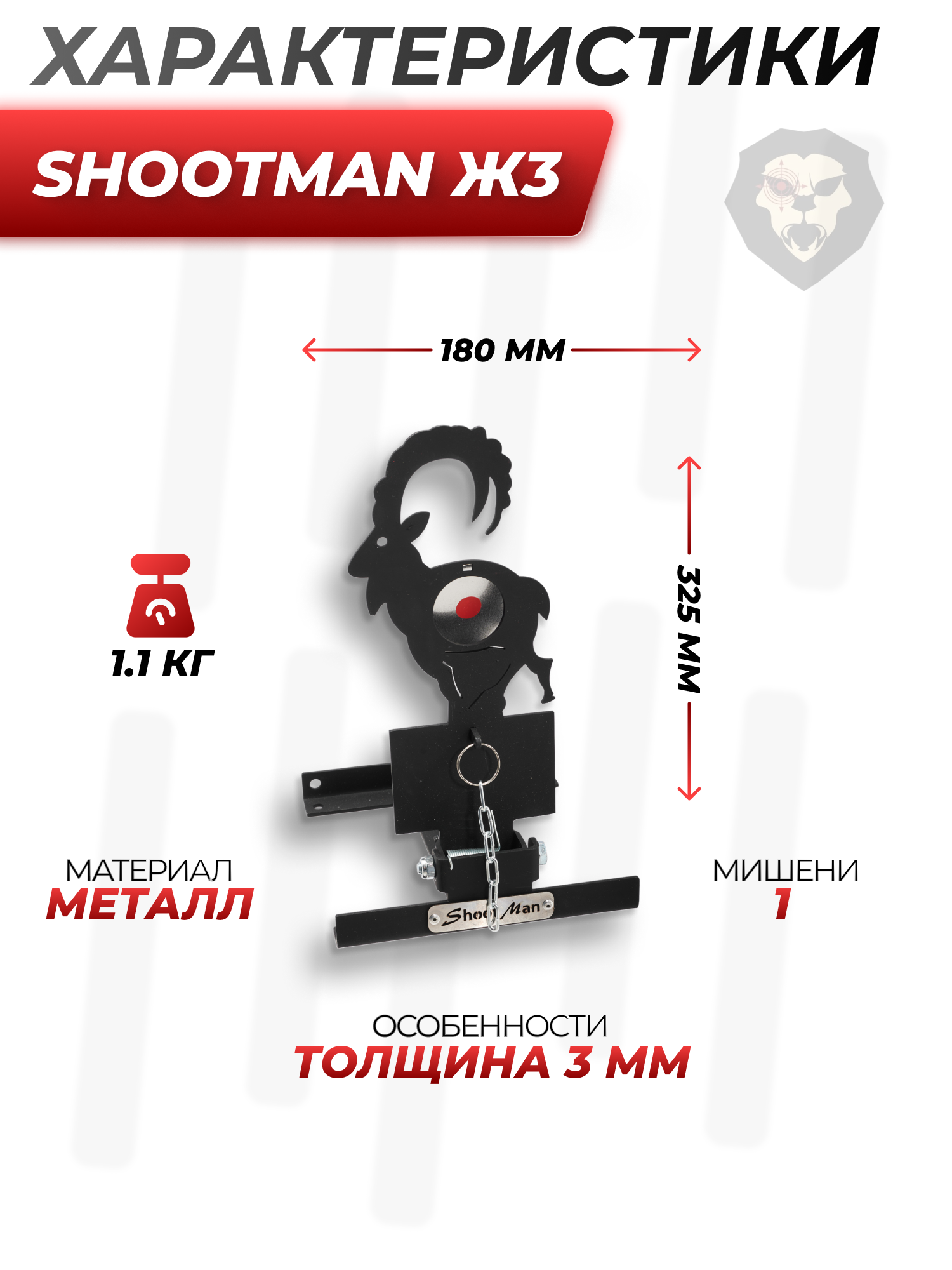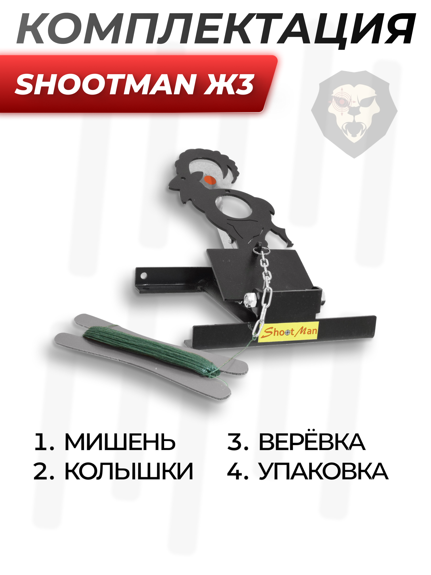 Обозреваемая мишень Шутман Ж 3 в виде профиля козла окрашена в черный цвет специальным противоударным порошковым составом. Благодаря покрытию подъемная цель не подвержена возникновению коррозийных очагов и может располагаться в помещении или на открытом пространстве. Изделие высотой 32.5 см содержит окошко по центру, а позади установлен круглый рычаг, меткое попадание по которому сбрасывает фиксатор пружины, в результате чего мишень падает навзничь.