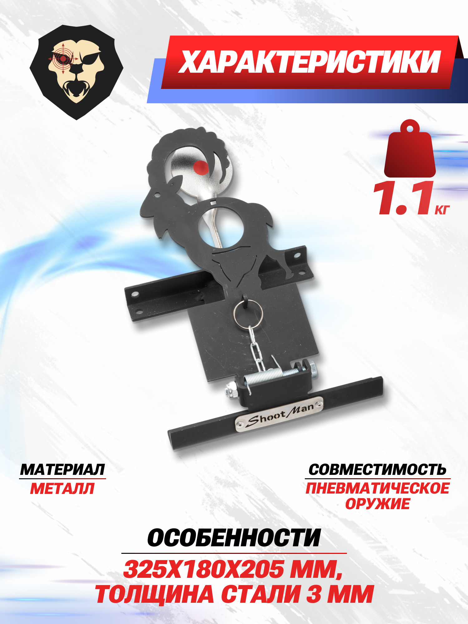 Для поднятия конструкции в изначальное положение к силуэту закреплена металлическая цепь с кольцом, к которому подвязывается 20-и метровый шнурок из паракорда. Благодаря такому конструктивному решению нет необходимости каждый раз покидать огневой рубеж для ручных манипуляций с мишенью. По заверению изготовителя, а также учитывая толщину стали, цель подходит для тренировок и развлекательной стрельбы из пневматики мощностью 3 Дж.