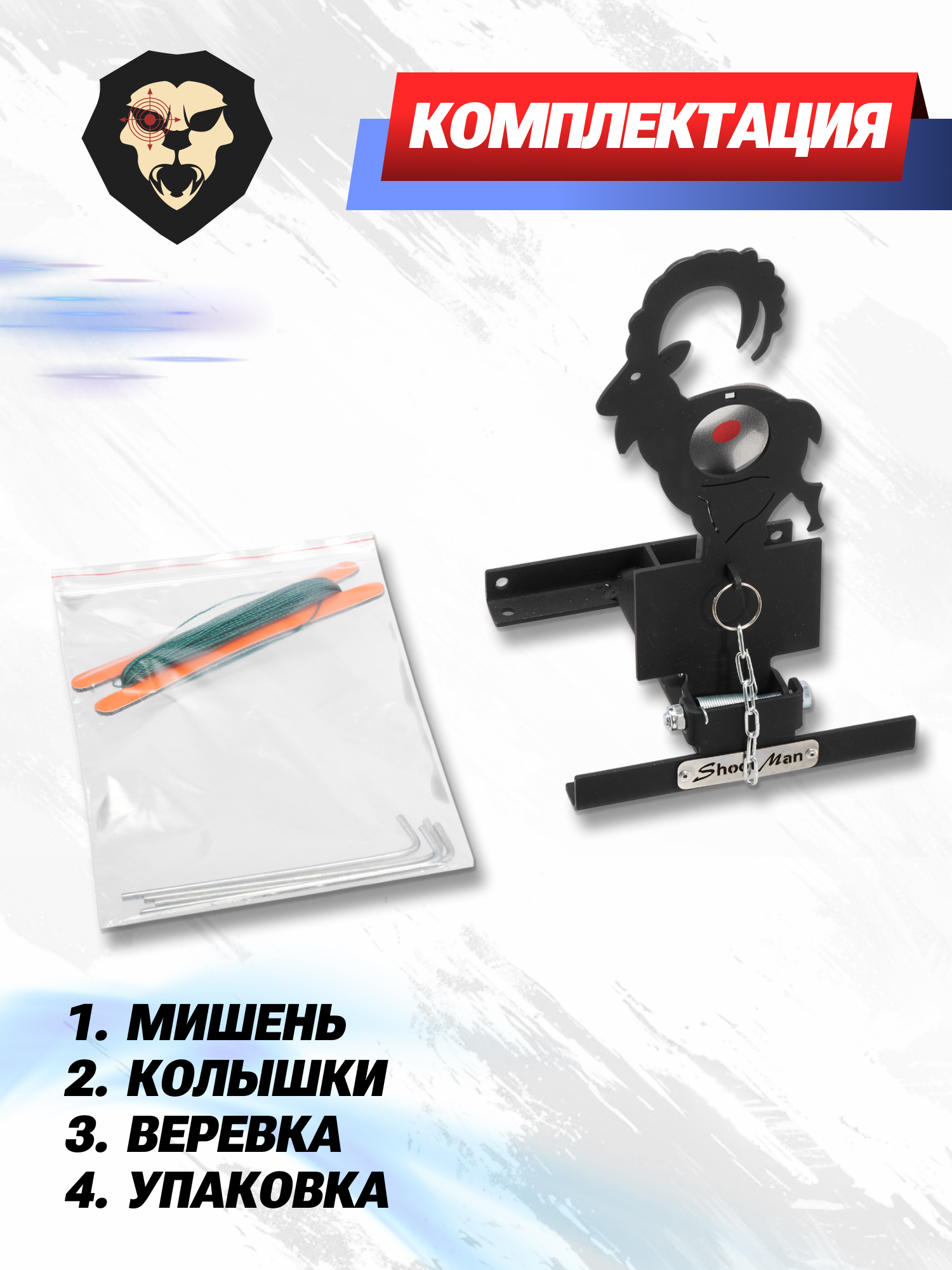 | Комплектация | Мишень, монтажные колышки — 4 шт, веревка, краткая документация, упаковка |