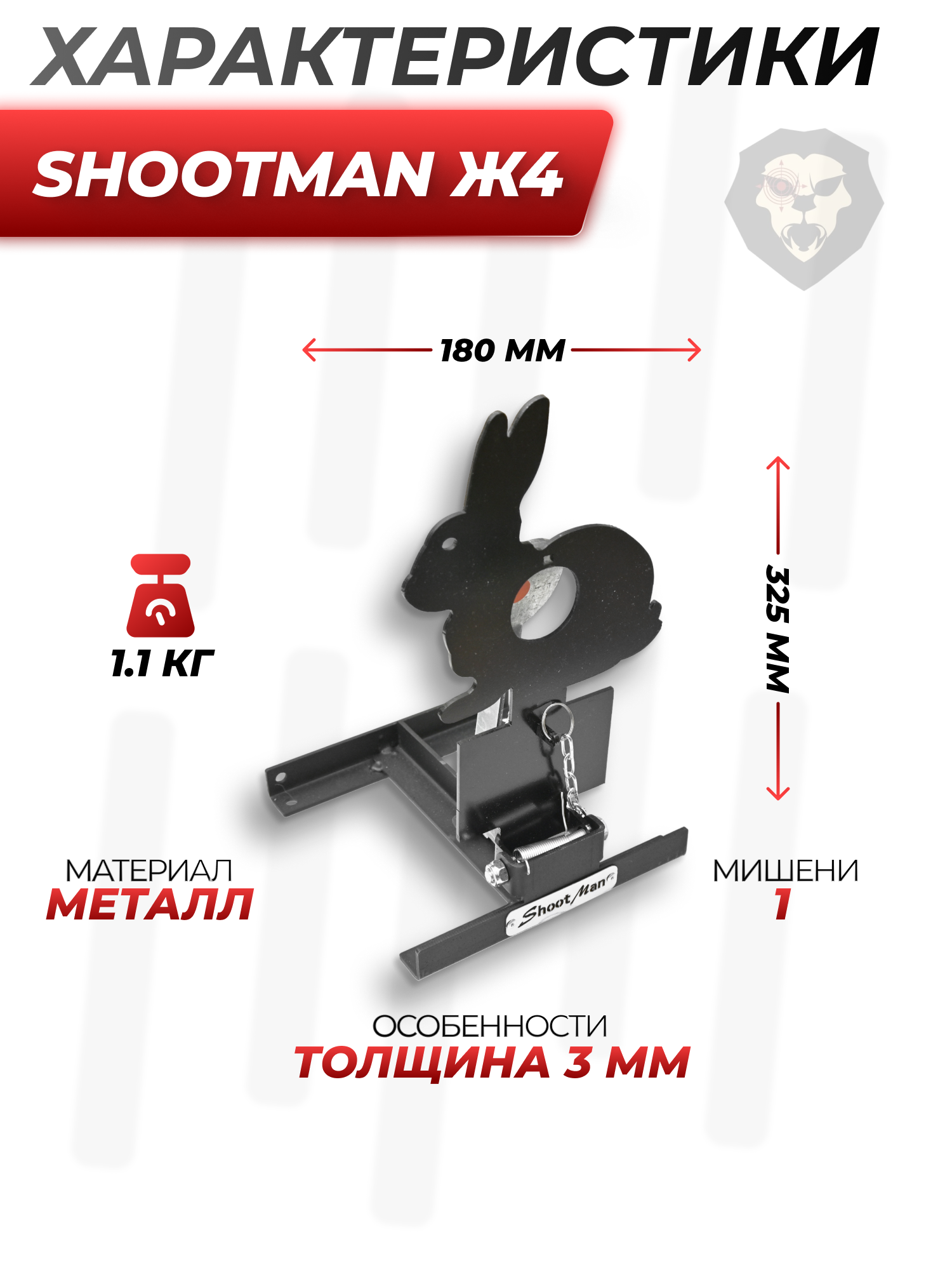 Владельцам пневматических пистолетов и винтовок с 3 Джоулями мощности фирма подготовила линейку подъемных устройств, поражение которых требует попадания точно в центр. К такого рода целям относится мишень Shootman Ж4, изготовленная из листа 3 мм стали. Модель покрыта специальной противоударной краской, которая не крошится и стойко выдерживает повышенную влажность, а также перепады температуры.