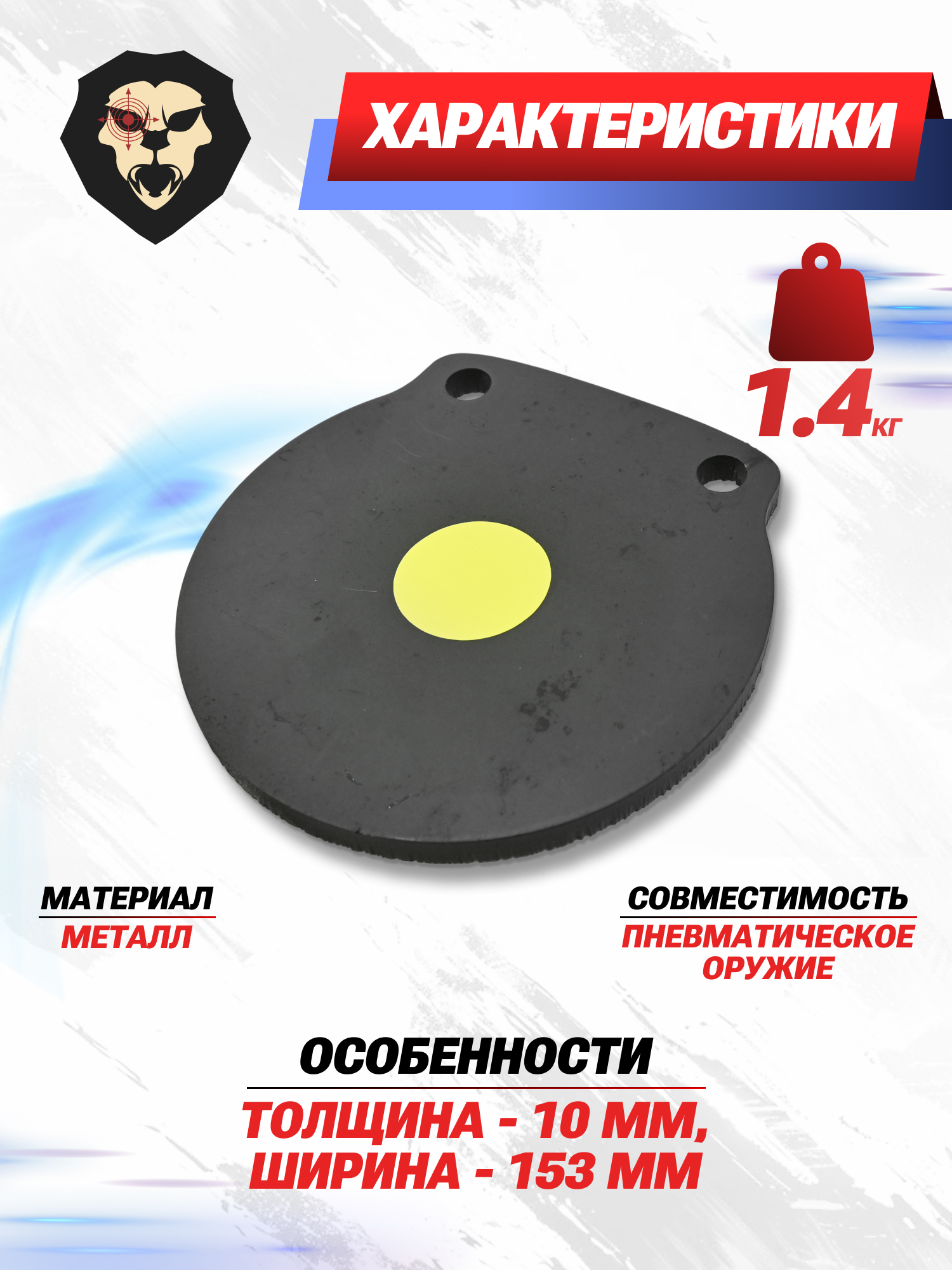 Образец предполагает работу как пружинно-поршневых и газобаллонных, так и PCP экземпляров пневматики. Кроме того, сталь 3 допускает стрельбу из мелкокалиберного огнестрела. Размер 153 мм также делает модель универсальной - габарит подойдет как для работы с пистолета на дистанции 10 м, так и из пневматической винтовки на 100-200 м.
