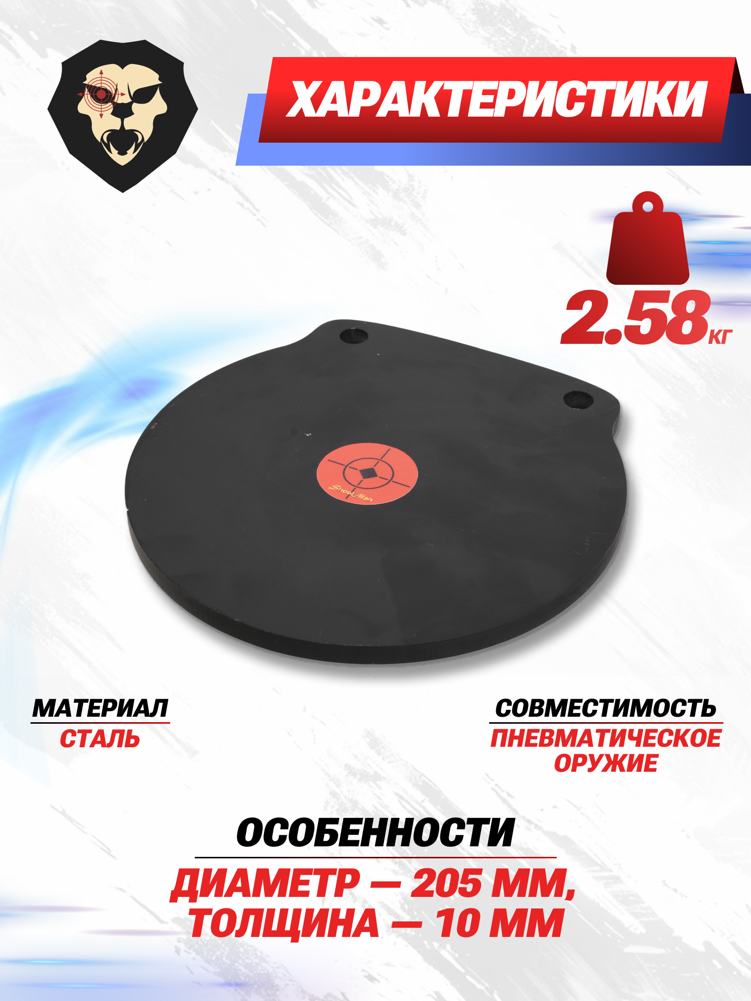 Изделие изготовлено из стали марки 3. Металл предназначен для приема попаданий из пневматического оружия. Кроме того, модель подойдет для работы из пистолетов и дробовиков на дистанции в 7-10 метров.