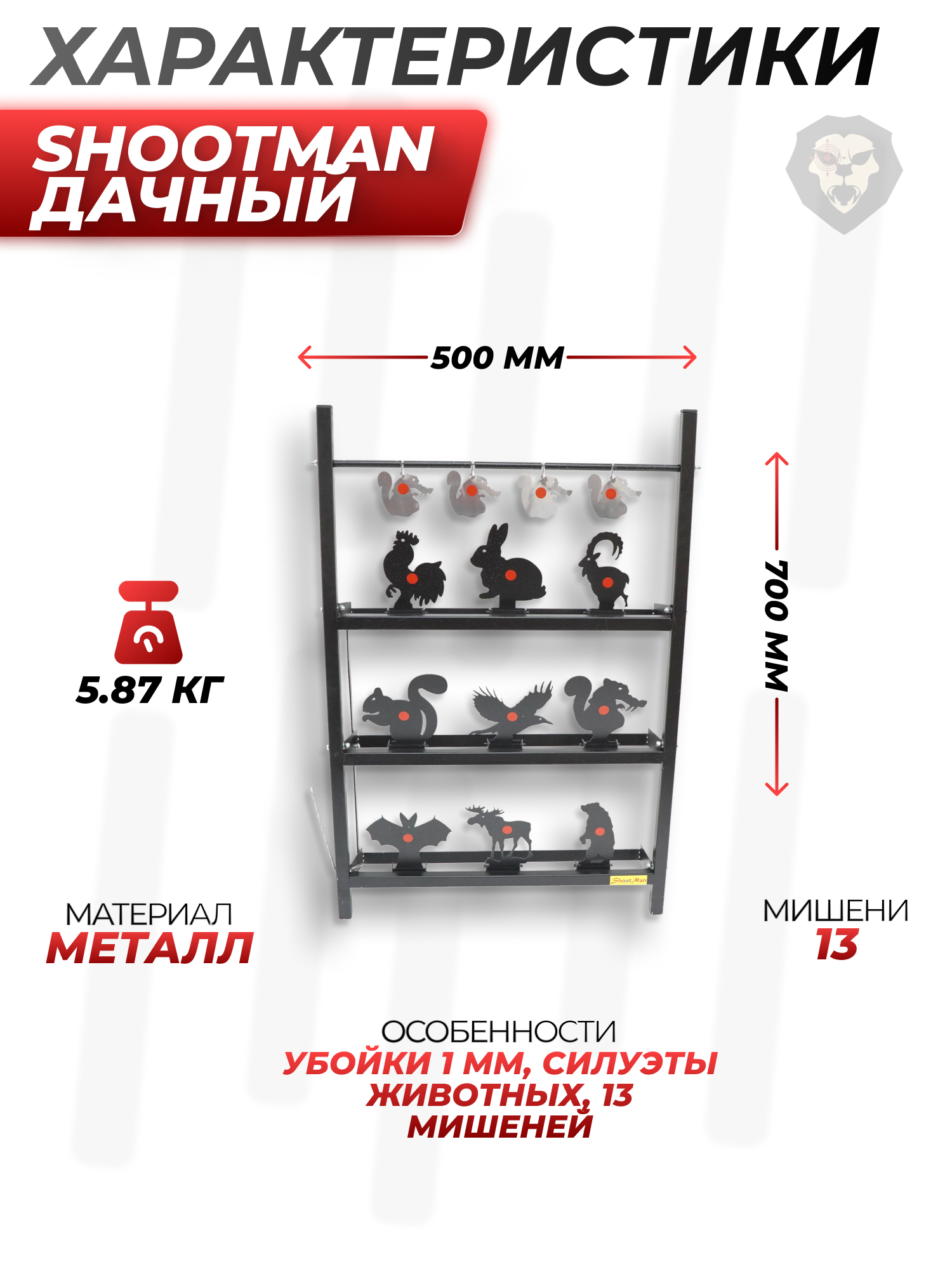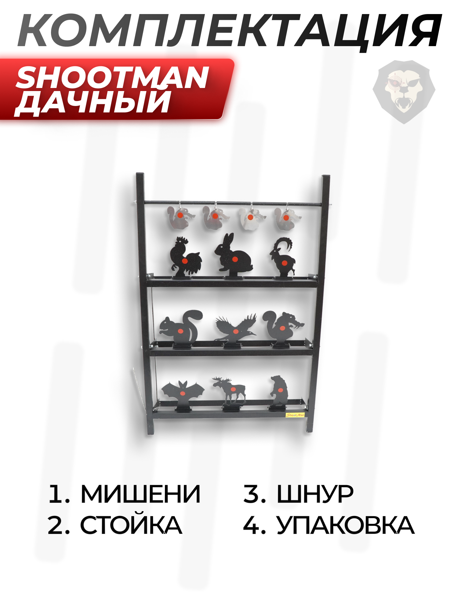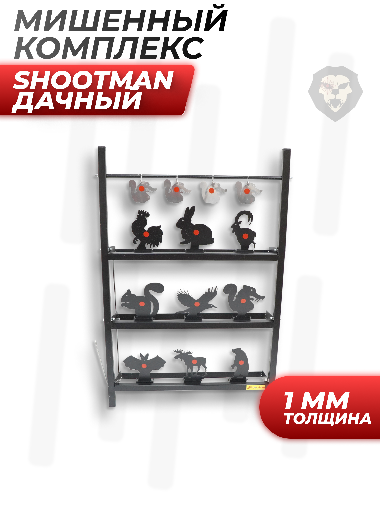 Среди продукции фирмы Shootman повышенным спросом пользуется мишенный комплекс дачный размером 50x70 сантиметров, который содержит специальный штатив с несколькими полками и фиксатором, позволяющим восстанавливать изначальное положение целей. В качестве оных выступают силуэты животных в количестве 13 штук. Девять металлических профилей устанавливаются на трех площадках посредством встроенных подставок, а оставшиеся 4 белки подвешиваются на верхней составной штанге.