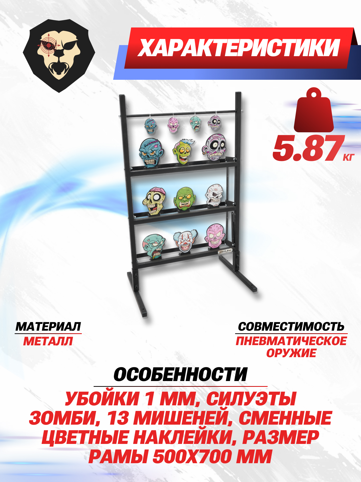 | Особенности | Убойки 1 мм, силуэты зомби, 13 мишеней, сменные цветные наклейки, размер рамы 500x700 мм |