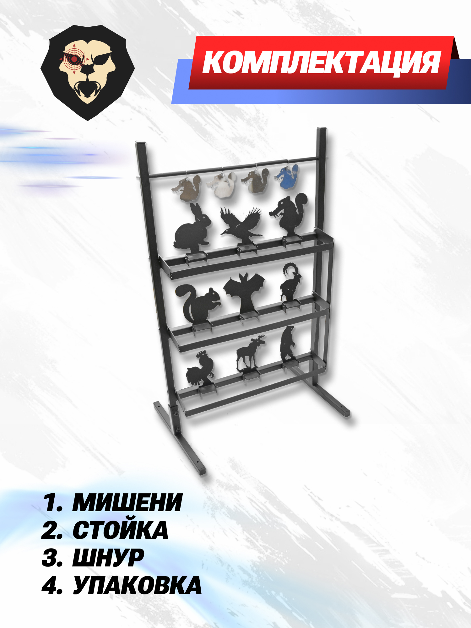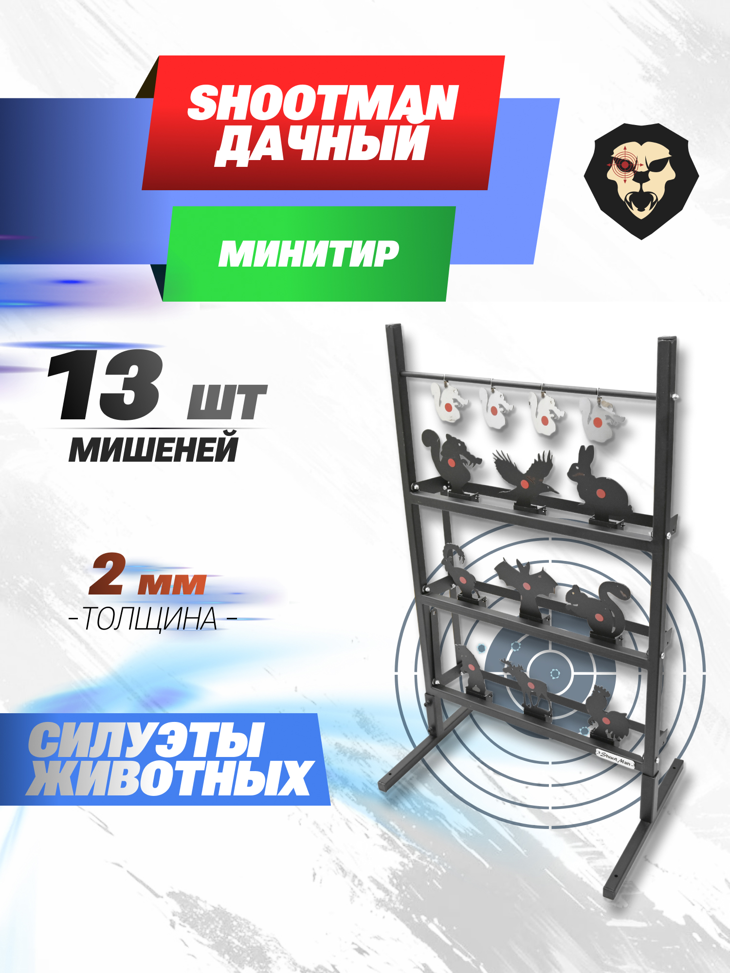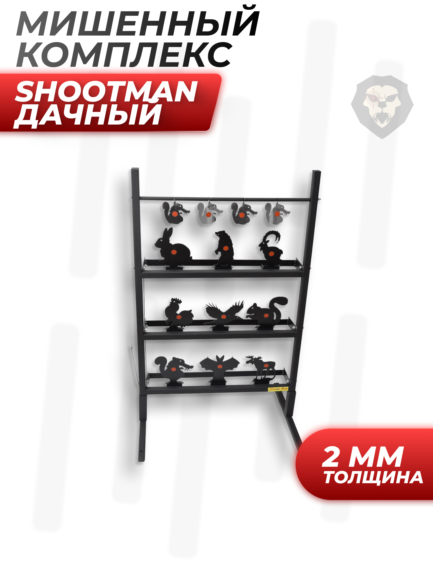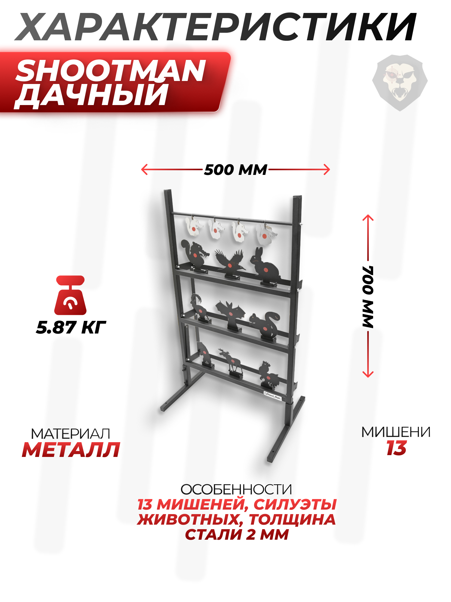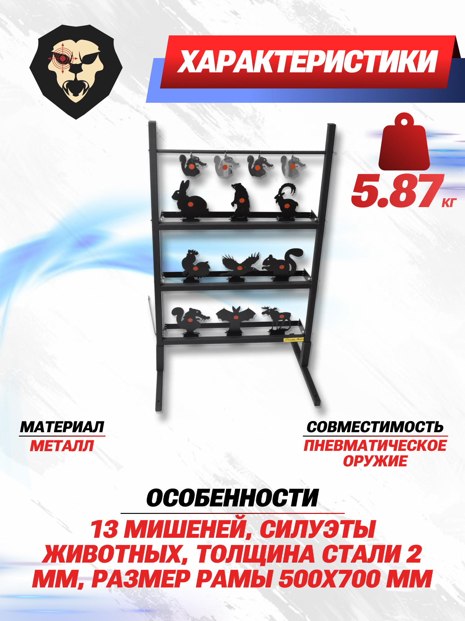 | Особенности | 13 мишеней, силуэты животных, толщина стали 2 мм, размер рамы 500x700 мм |