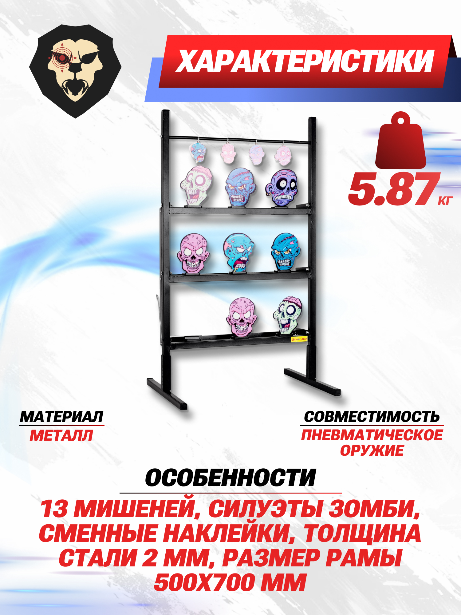 | Особенности | 13 мишеней, силуэты зомби, сменные наклейки, толщина стали 2 мм, размер рамы 500x700 мм |