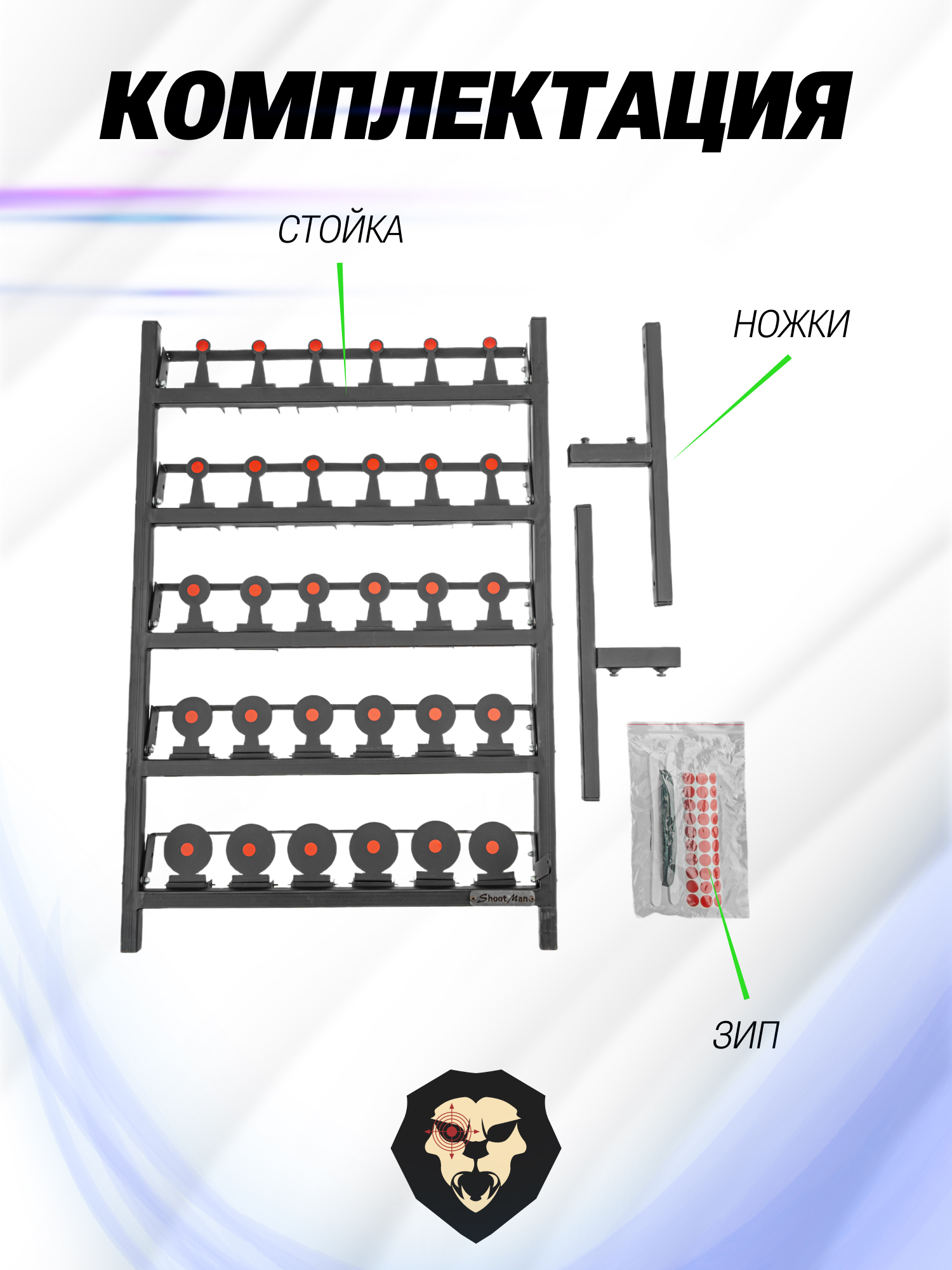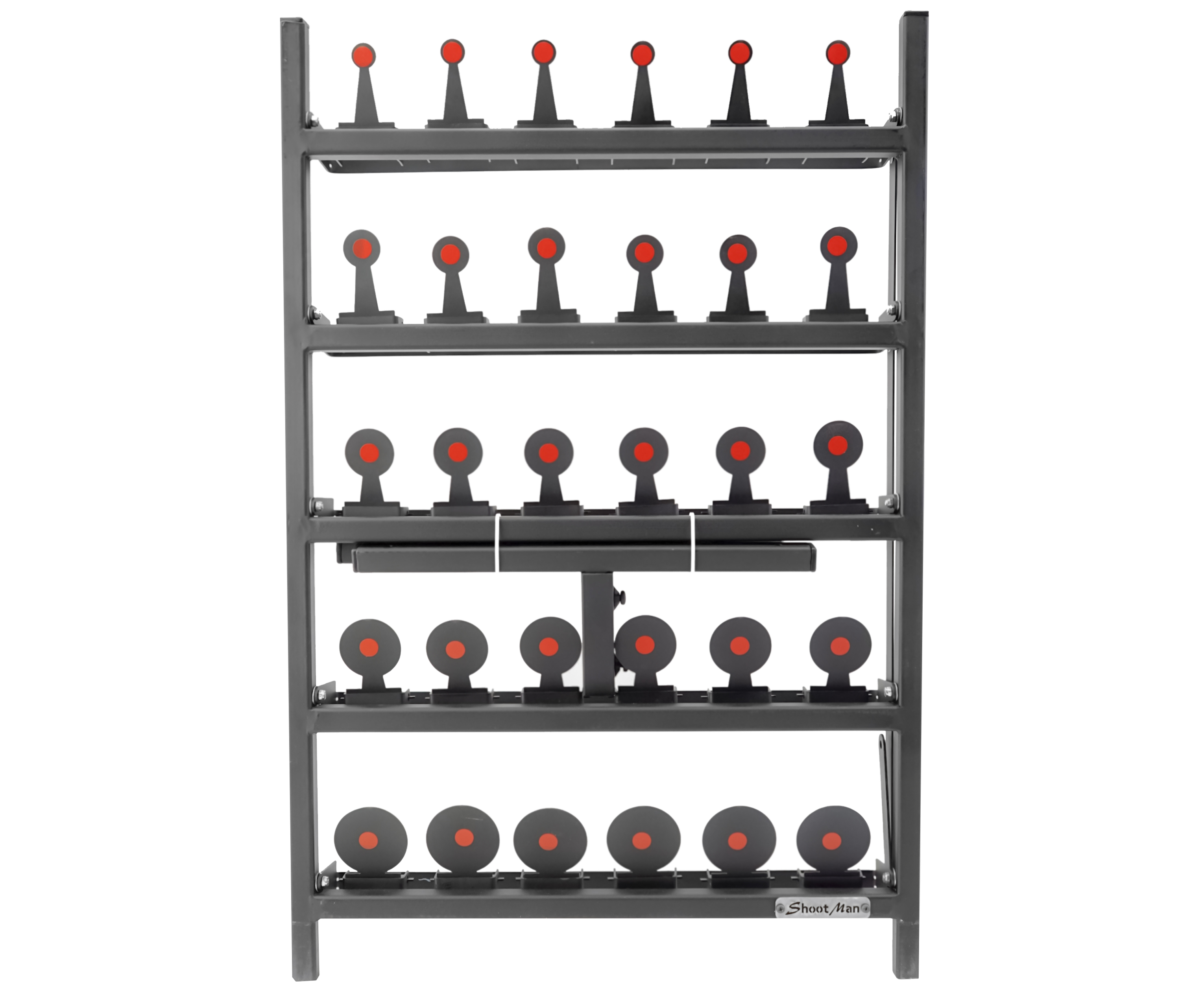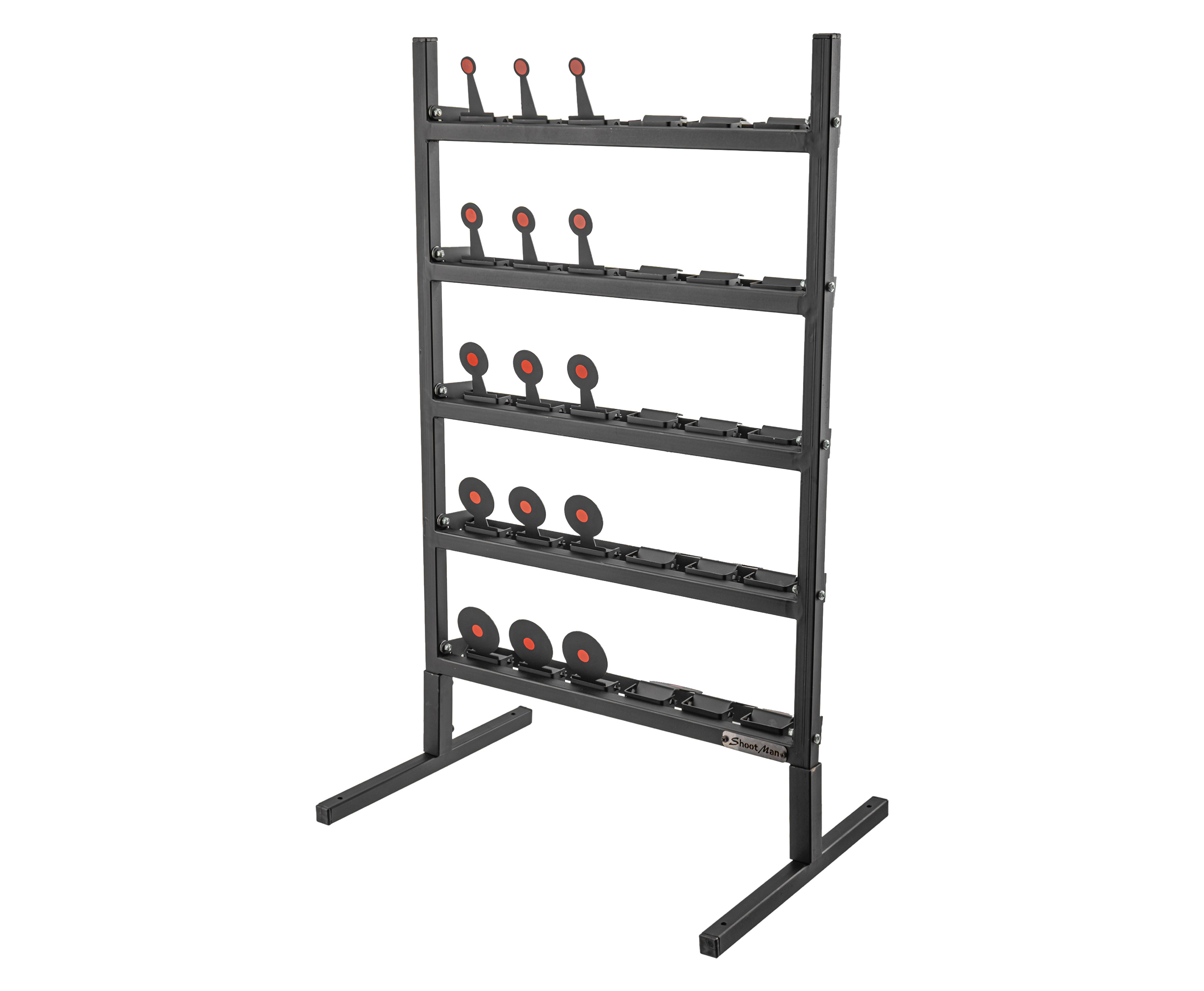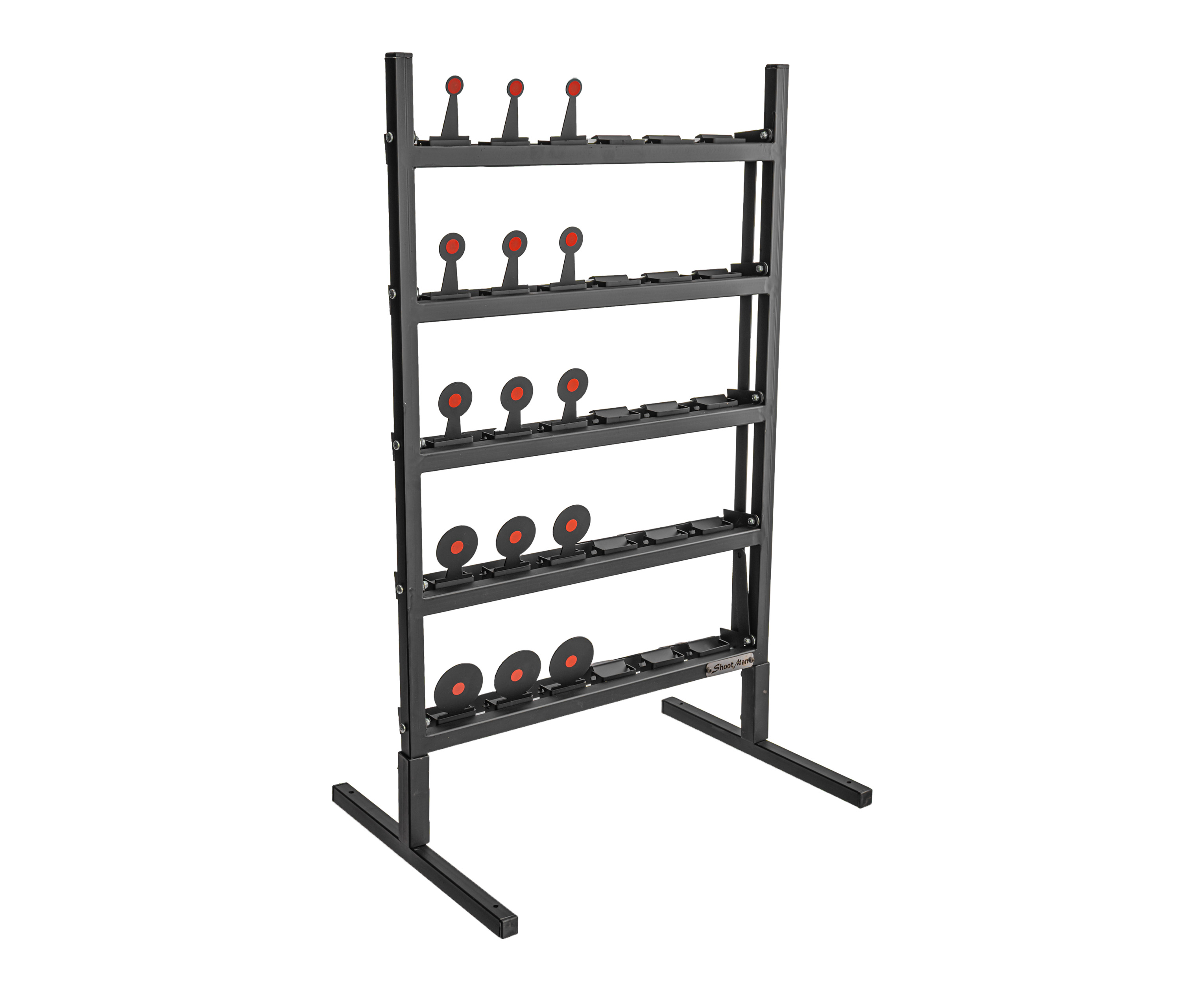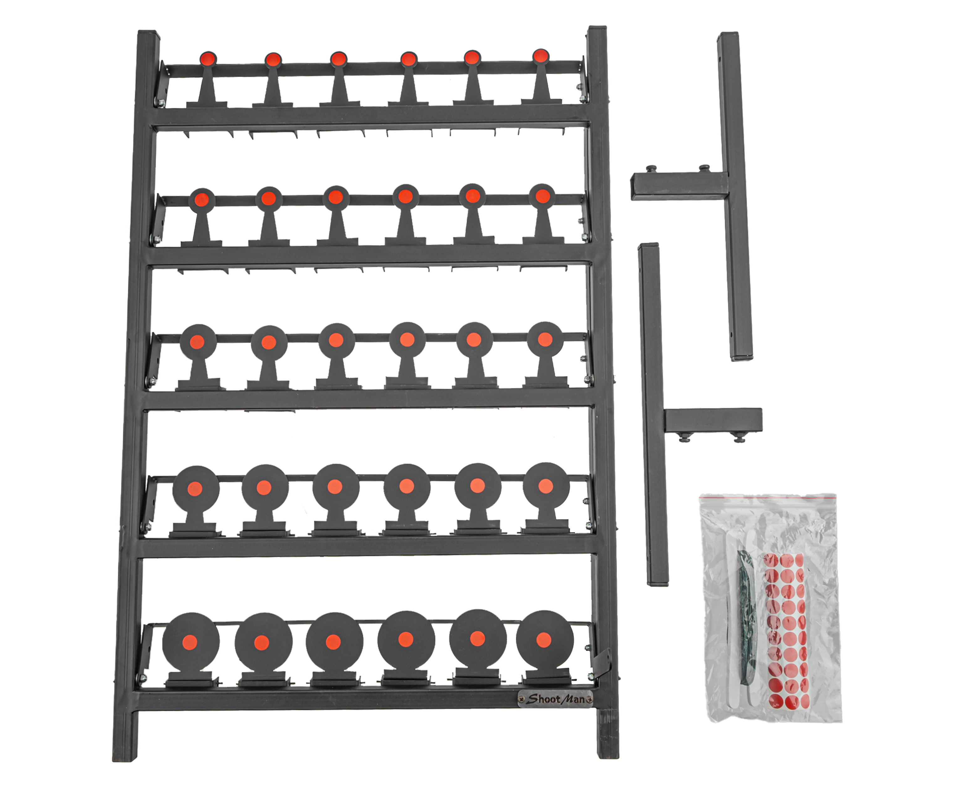 Каждая мишень для пневматики в составе комплекса Shootman выполнена в виде круга. Материалом для них выступает миллиметровая сталь, таким образом, «убойки» рассчитаны на поражение из маломощных стрелковых единиц. Комплекс оптимален, чтобы попрактиковаться в меткости и скорости наведения из страйкбольных приводов или газобаллонных пистолетов.