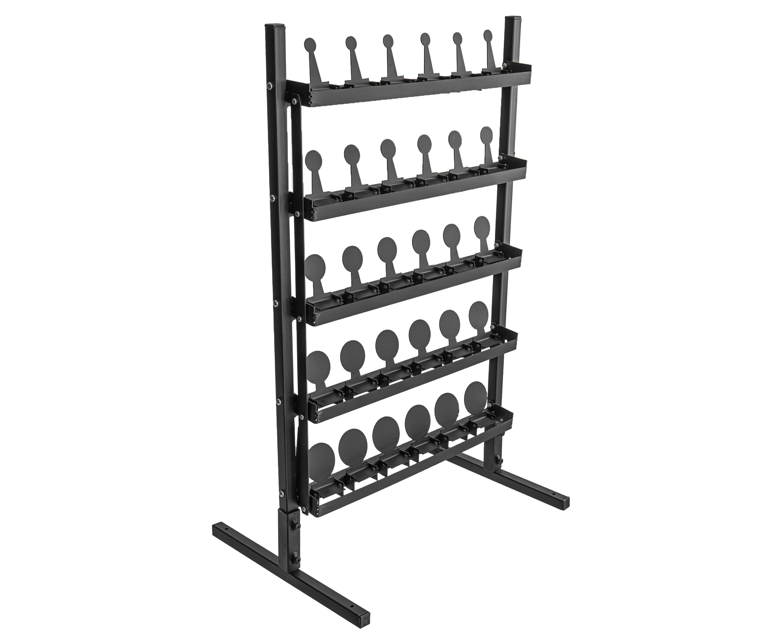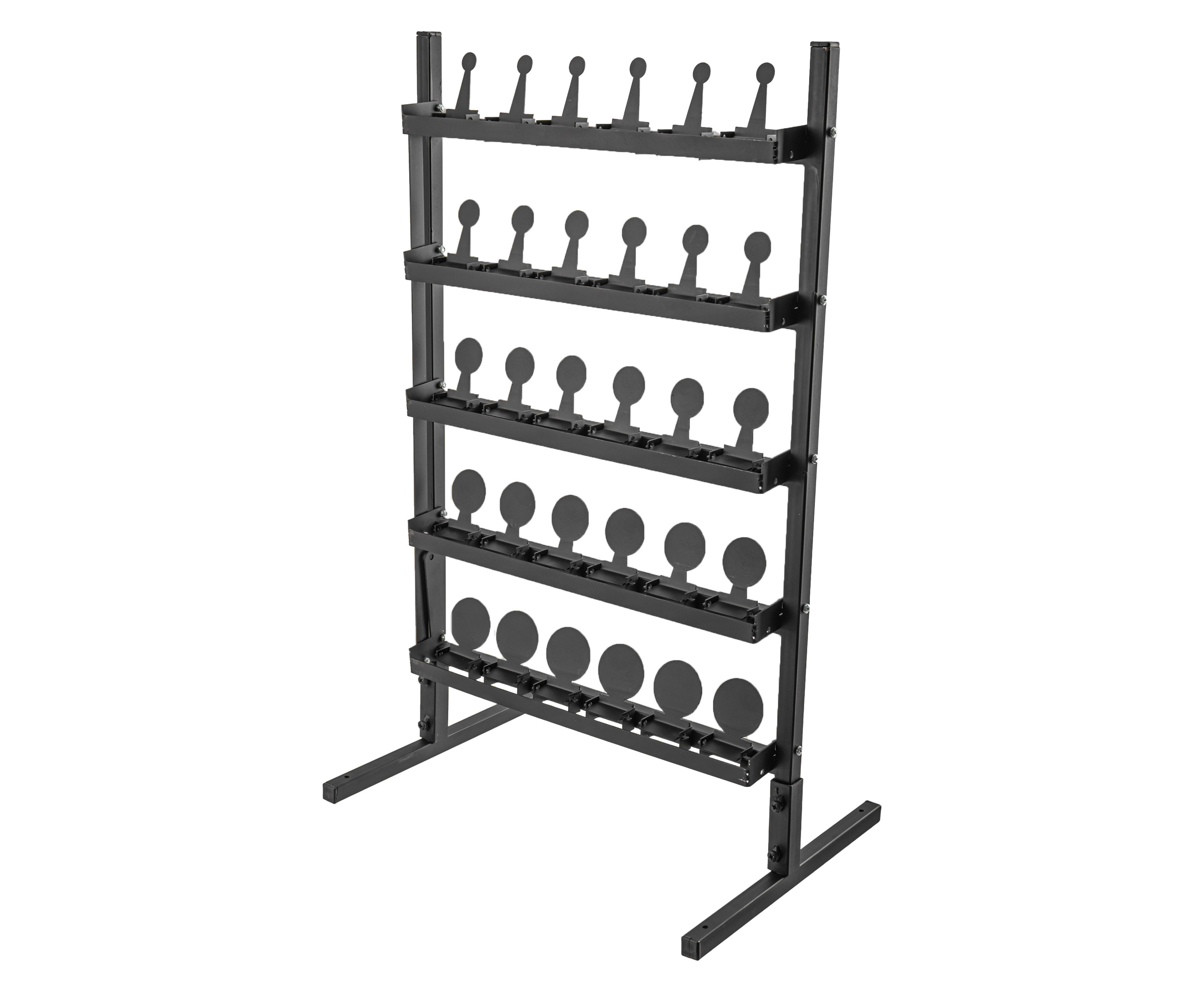 Такая особенность, к примеру, заявлена в рассматриваемом комплекте «Снайпер». Он состоит из каркаса на двух съемных стойках и 30 мишеней - комплекс легко разобрать для перевозки и хранения, а установка не займет много времени. В основе стенда размером 500x700 мм лежит металлический профиль, образующий несущие опоры и перекладины - в сумме имеется шесть горизонтальных полок.