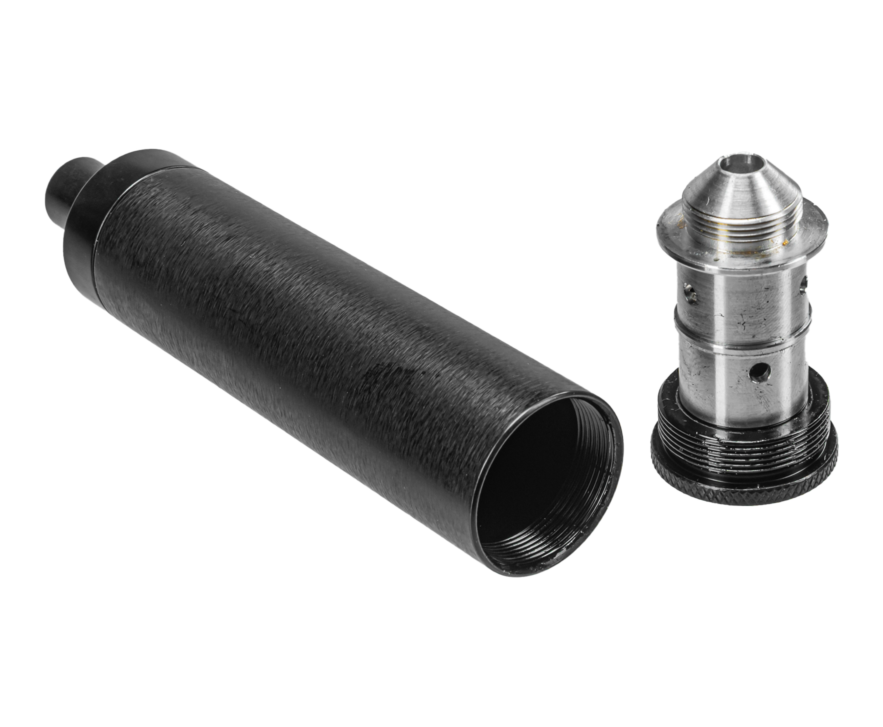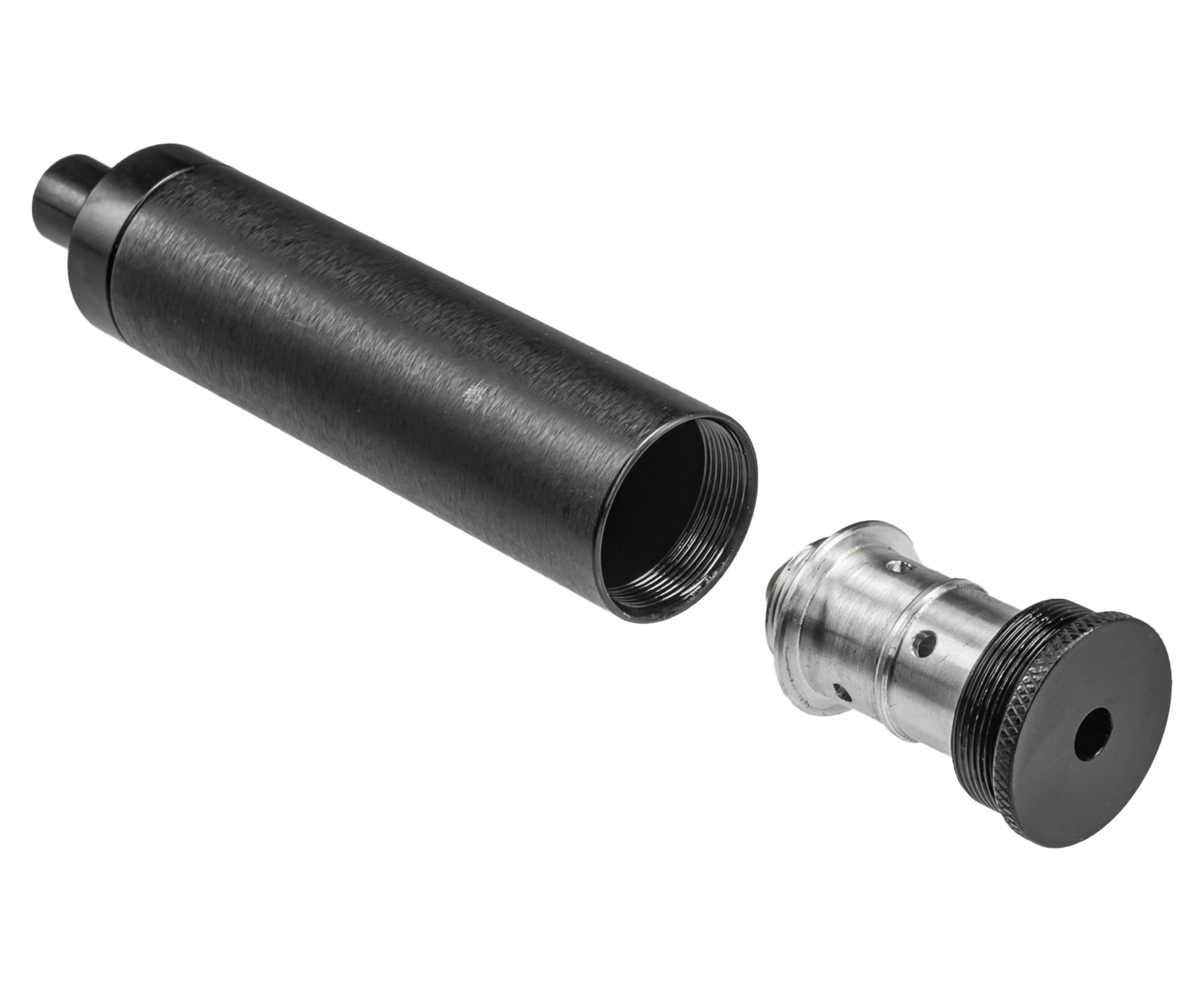 За приглушение резкости хлопка отвечают специальные вкладные стаканы из стали, в которых происходит сепарация потока воздуха. Их максимальное количество в сборке может достигать четырех штук. Два поставляются в наборе и имеют диаметр юбки 25 и 30 мм.