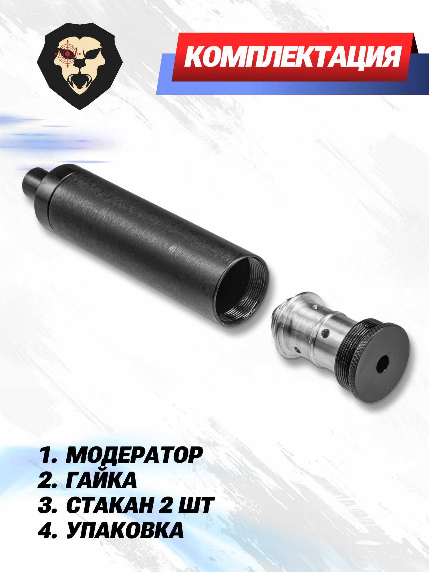 Комплектация Модератор, гайка-натяжитель ствола, стакан - 2 шт, упаковка