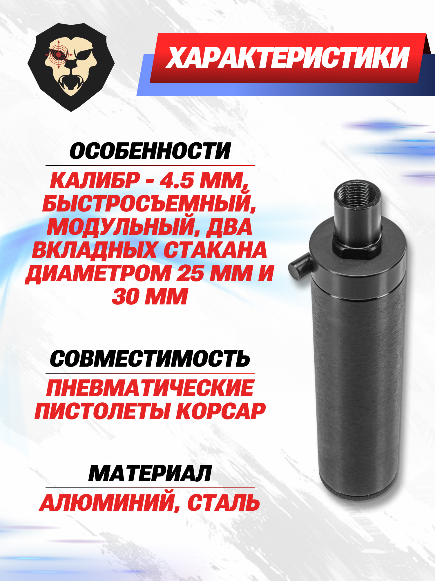 Саундмодератор обозреваемого исполнения предназначается для пистолетов Корсар в калибре 4.5 мм. Кожух изготавливается из алюминиевого сплава и подвергается дополнительной обработке противокоррозионным покрытием. Изделие, кроме прочего, отличается модульной конструкцией.