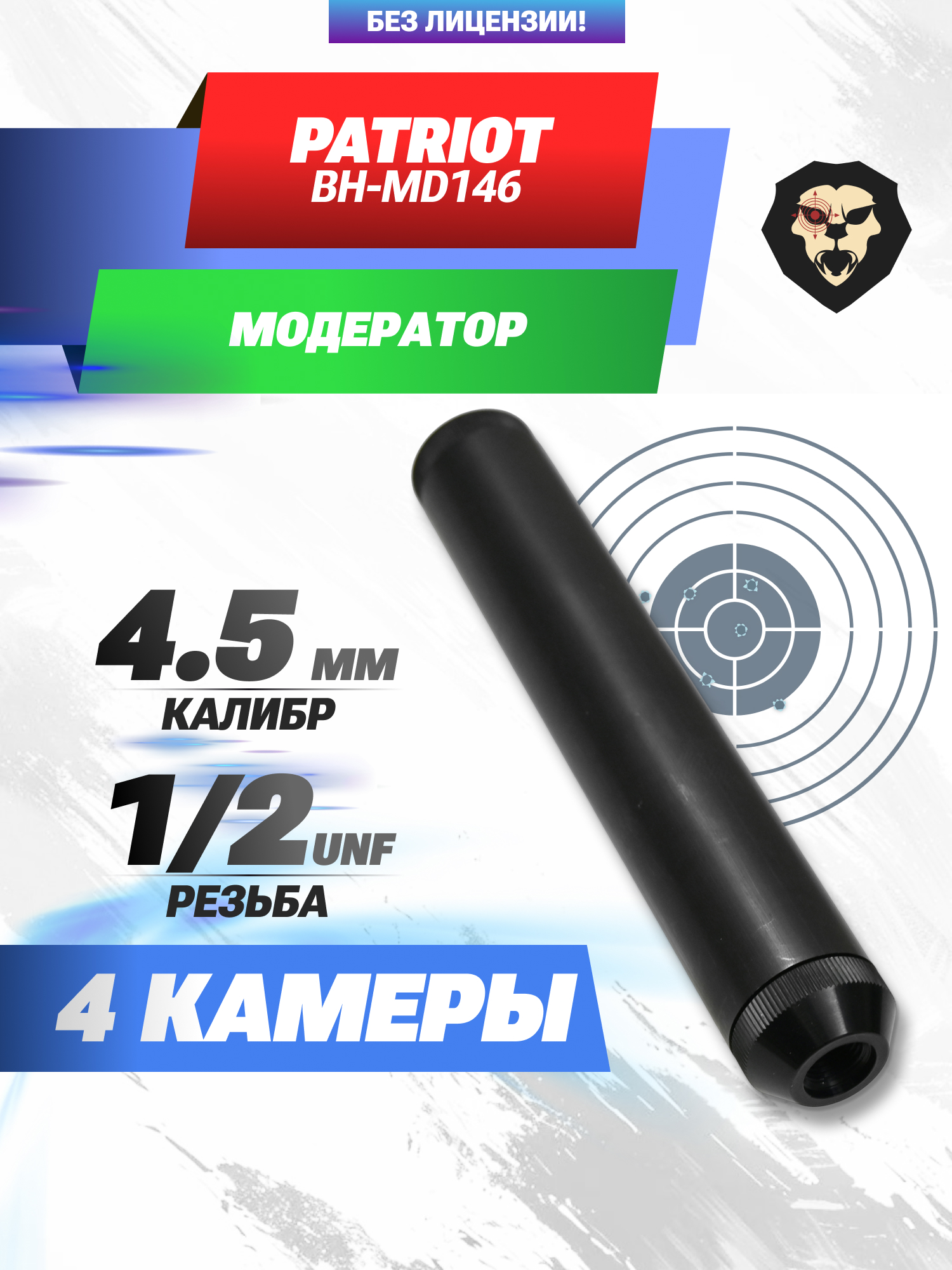 Глушитель для пневматики 4.5 мм BH-MD146 производства фирмы Патриот подходит на резьбу полдюйма. Это позволило использовать предмет с винтовками компаний Хатсан, Kral, Эваникс, Вайрух, FX и BSA.