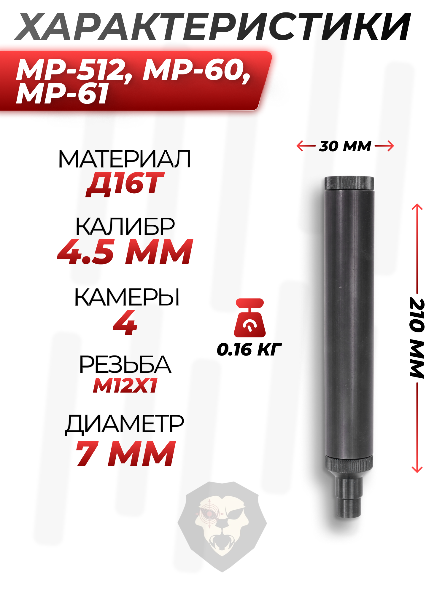 Артикул производителя BH-MD147 Модератор Patriot BH-MD147 для MP-512, MP-60, MP-61 (4 камеры, M12x1) по низкой цене 2575 руб. Модель со штрихкодом производителя Вы можете оплатить наложенным платежем с доставкой или в отделении транспортной компании (ПЭК, СДЭК, Boxberry). Ваш заказ со штрихкодом 2000000053486 забрать на почте с оплатой при получении в любой части Российской Федерации.