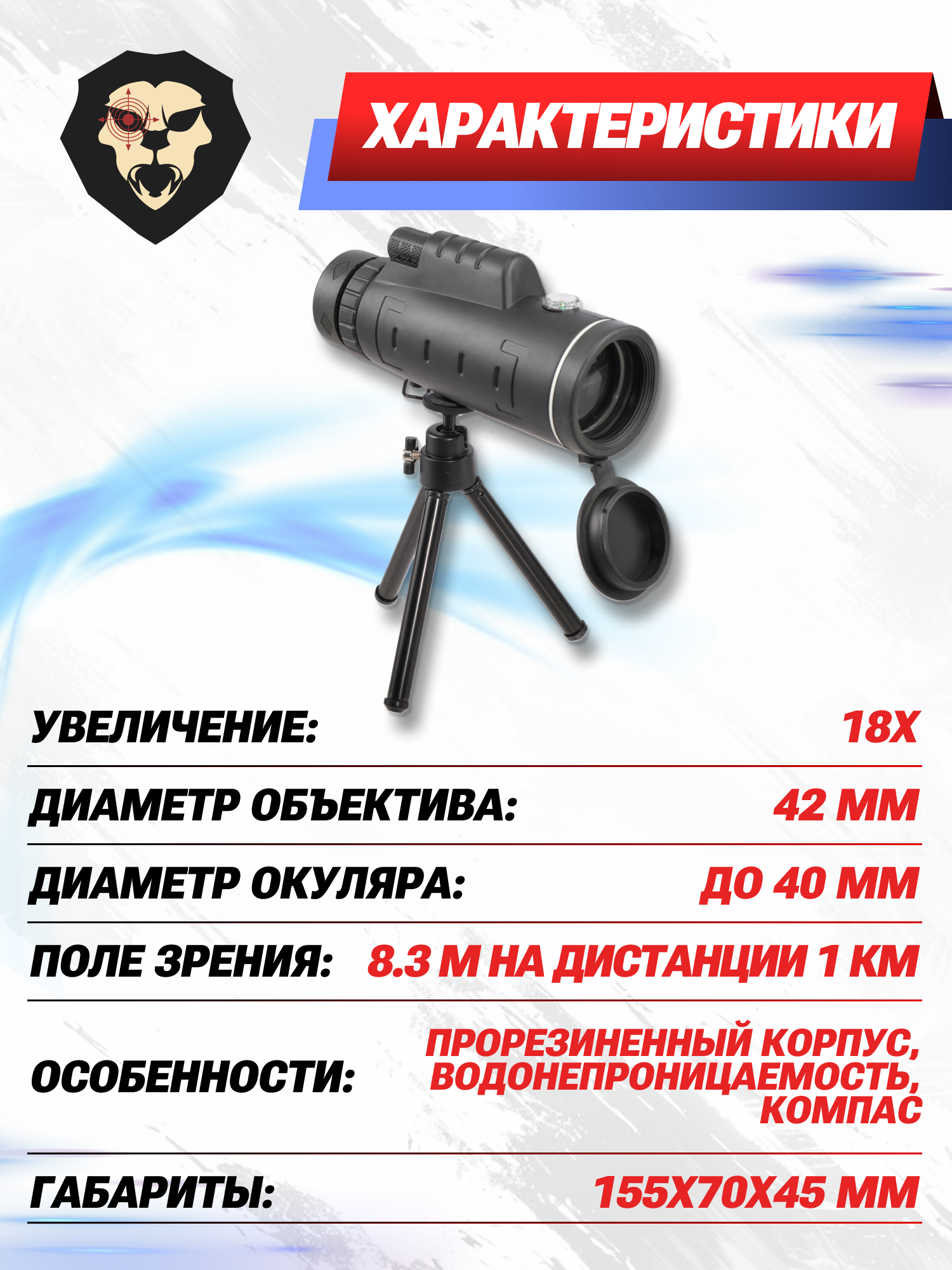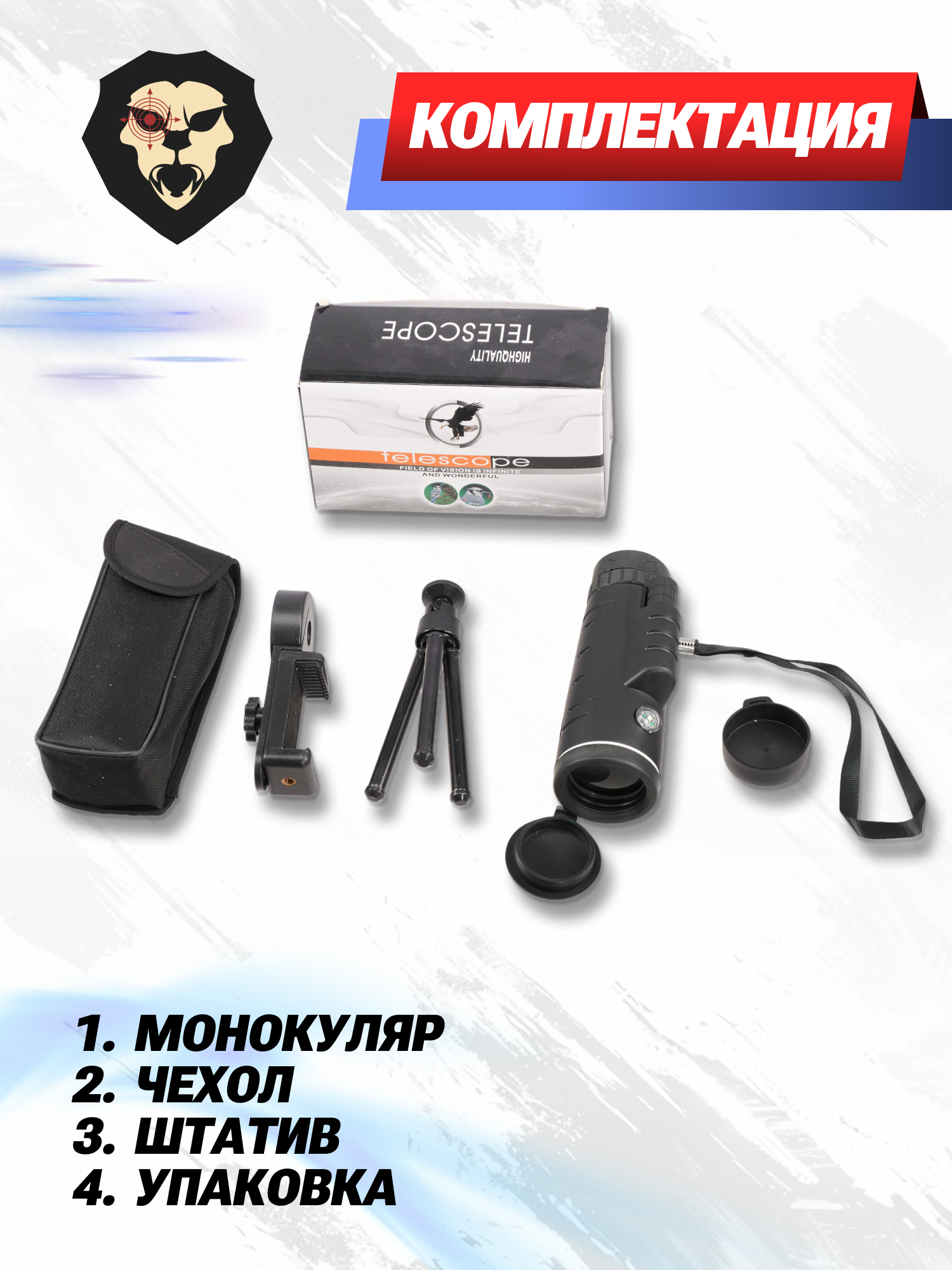 | Комплектация | Монокуляр, чехол, штатив, салфетка для чистки, защитные крышки, инструкция, упаковка |