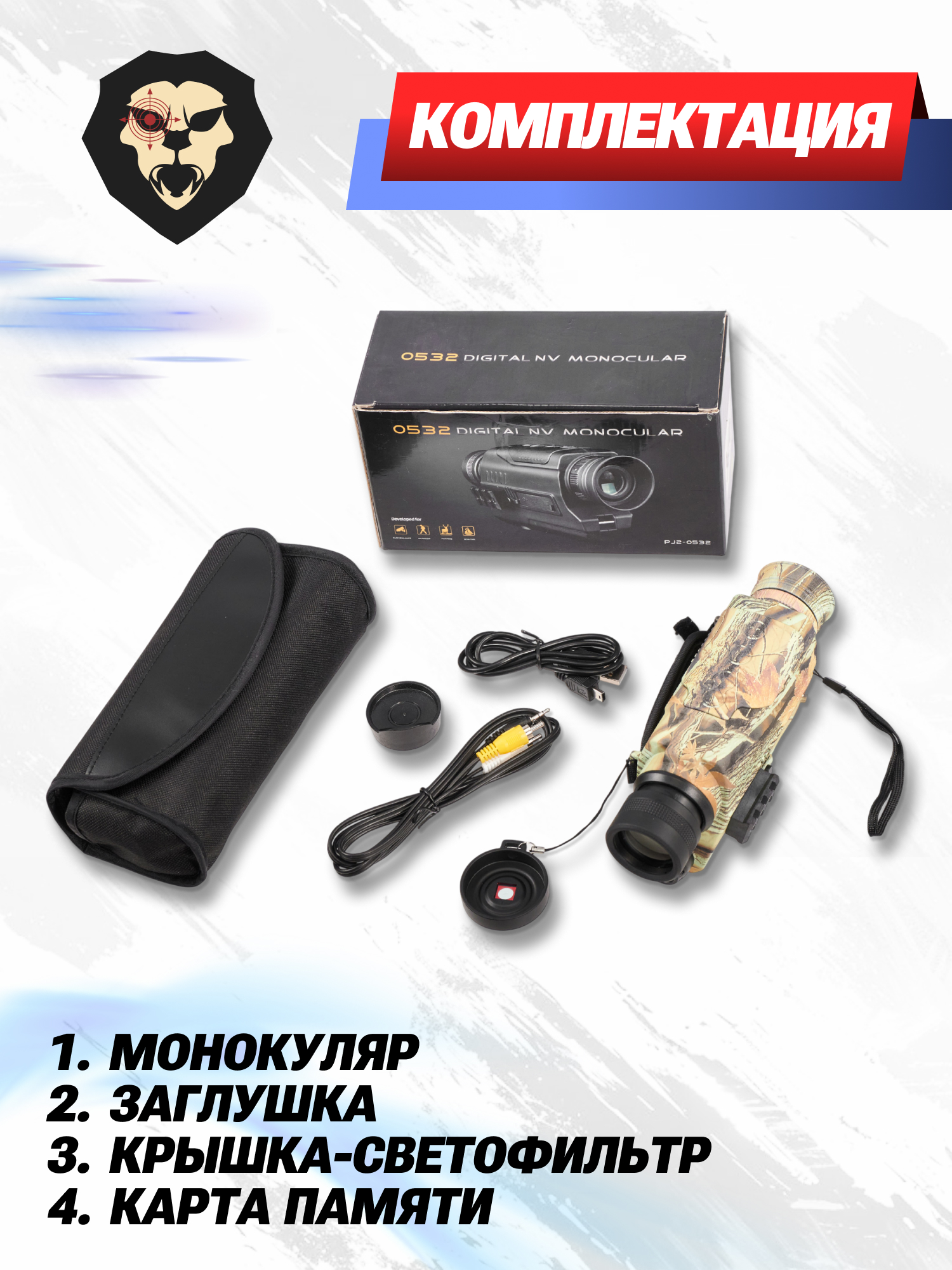 | Комплектация | Монокуляр, карта памяти 8GB micro-SD, крышка-светофильтр, заглушка, переходник mini-USB — USB, переходник 3.5 — RCA, краткая документация, салфетка, темляк, чехол, упаковка |