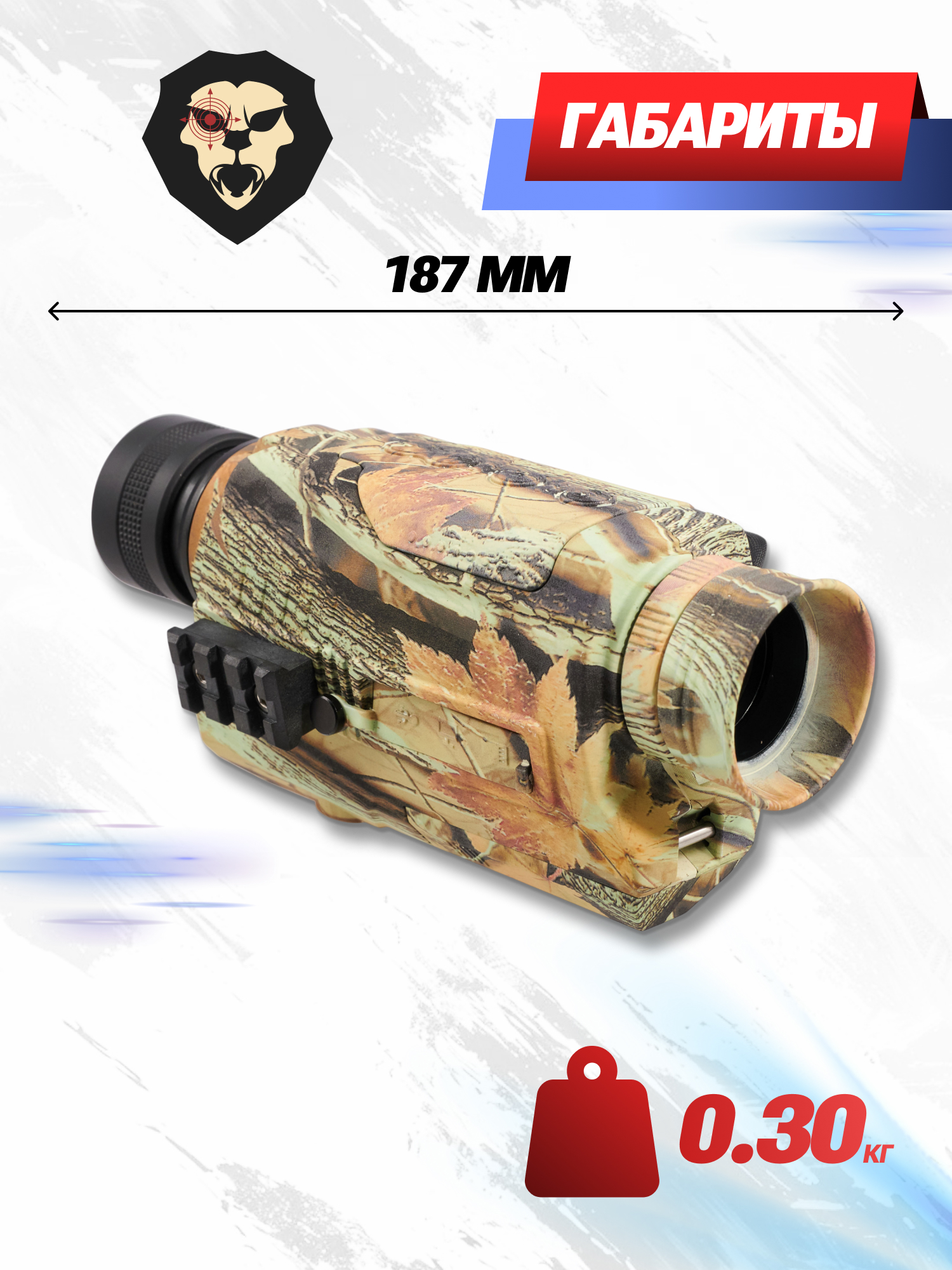 Ночной монокуляр для охоты снабжен штатным ИК-фонарем с 9 позициями яркости. В условиях полной темноты экземпляр способен отобразить местность на 200 метрах удаления.