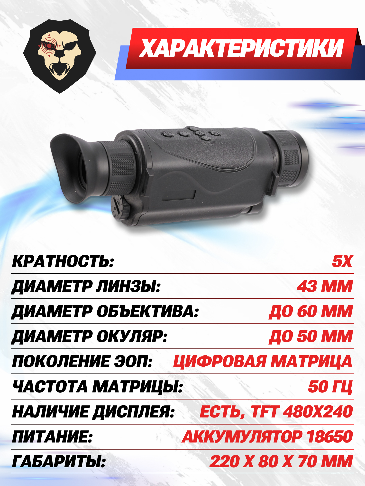 Обозреваемый прибор характеризуется наличием цифрового 5-и кратного зума с поворотным маховиком фокусировки на 43 мм объективе. Прибор функционирует как при естественных источниках освещения, так и в полной темноте, благодаря инфракрасному излучателю мощностью 5 Вт с наличием 9 степеней яркости. При активации встроенного ИК фонаря дистанция наблюдения достигает 1000 метров, при этом луч не заметен органами зрения диких зверей.