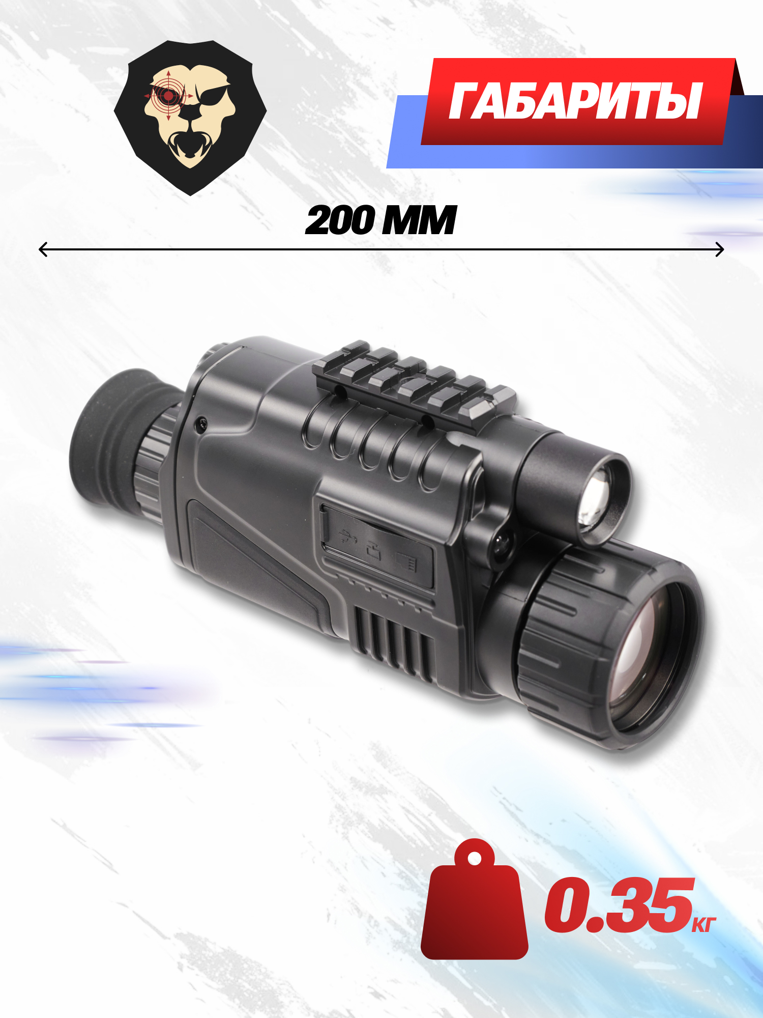 При длине монокуляра 200 миллиметров его масса не превышает 400 грамм за счет применения облегченного полимера, который также отличается повышенной устойчивостью ко всевозможным ударным нагрузкам и перепадам температур. С целью защиты разъемов от попадания загрязняющих элементов и влаги изготовителем предусмотрена специальная прорезиненная гибкая накладка.