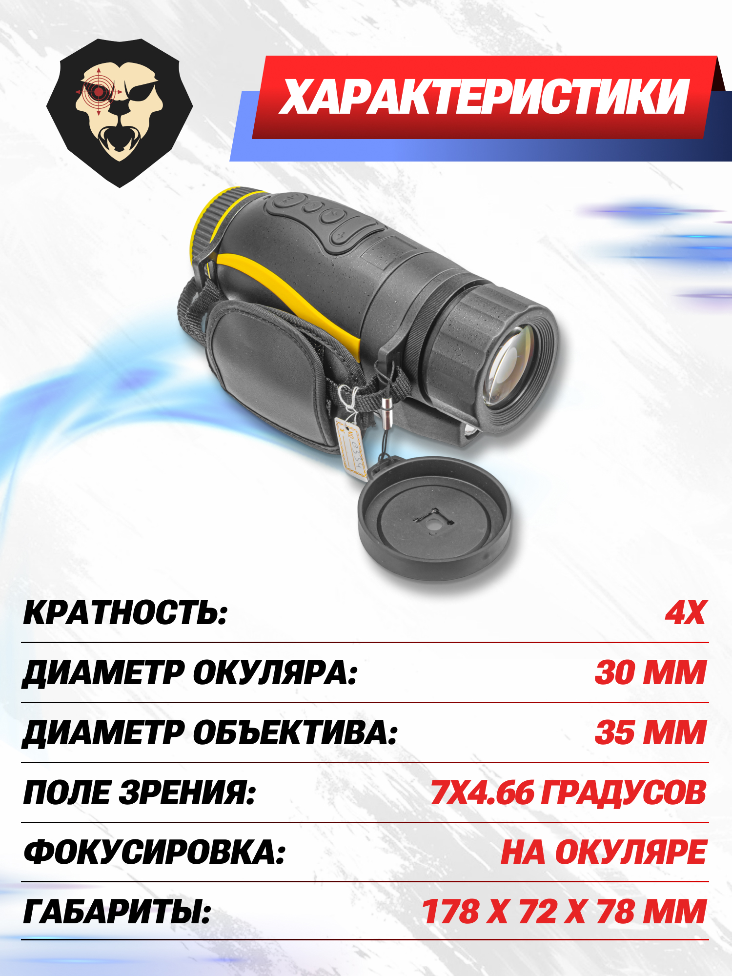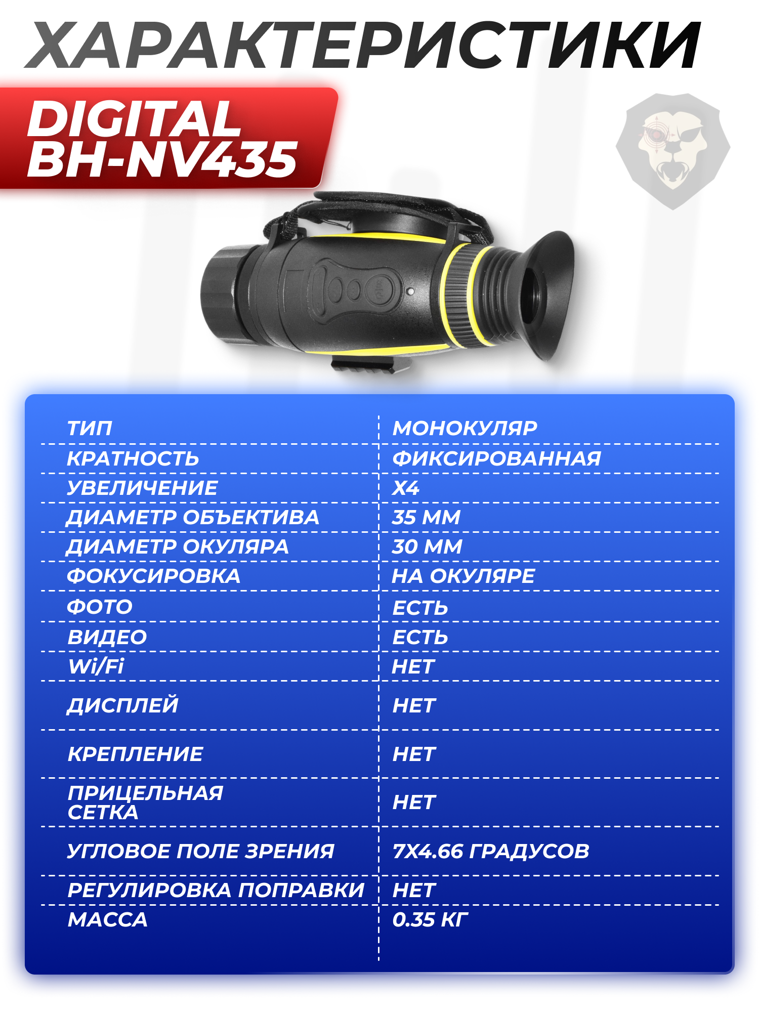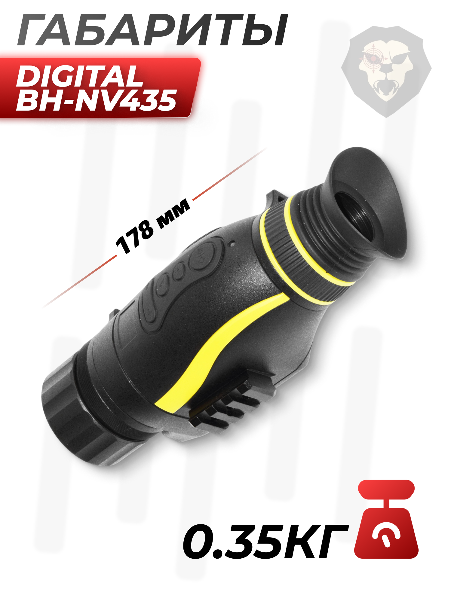 Digital BH-NV435 — монокуляр ночного видения с четырехкратным увеличением изображения. В условиях полной темноты модель способна отображать четкую картинку на дистанции в 300 м.