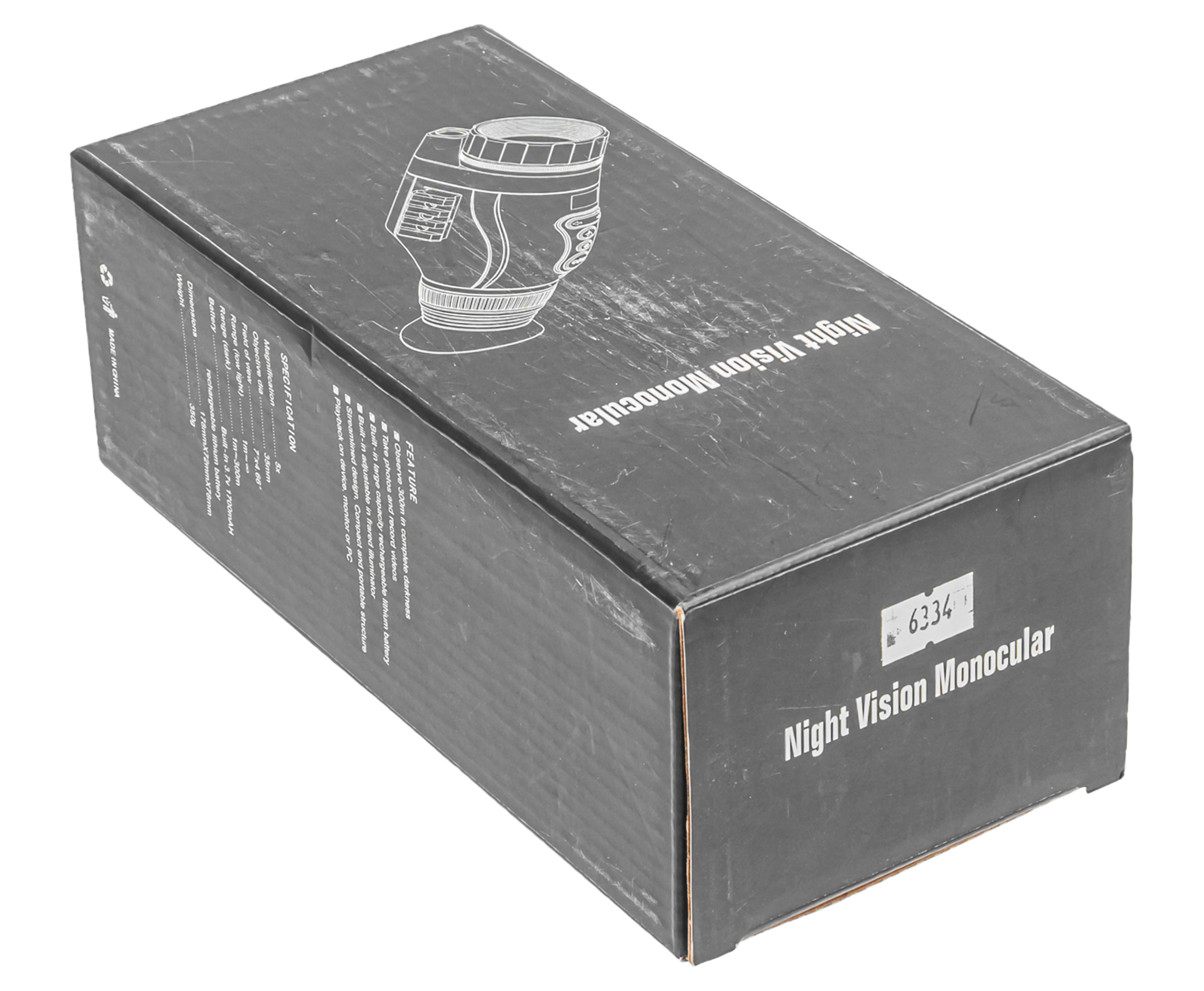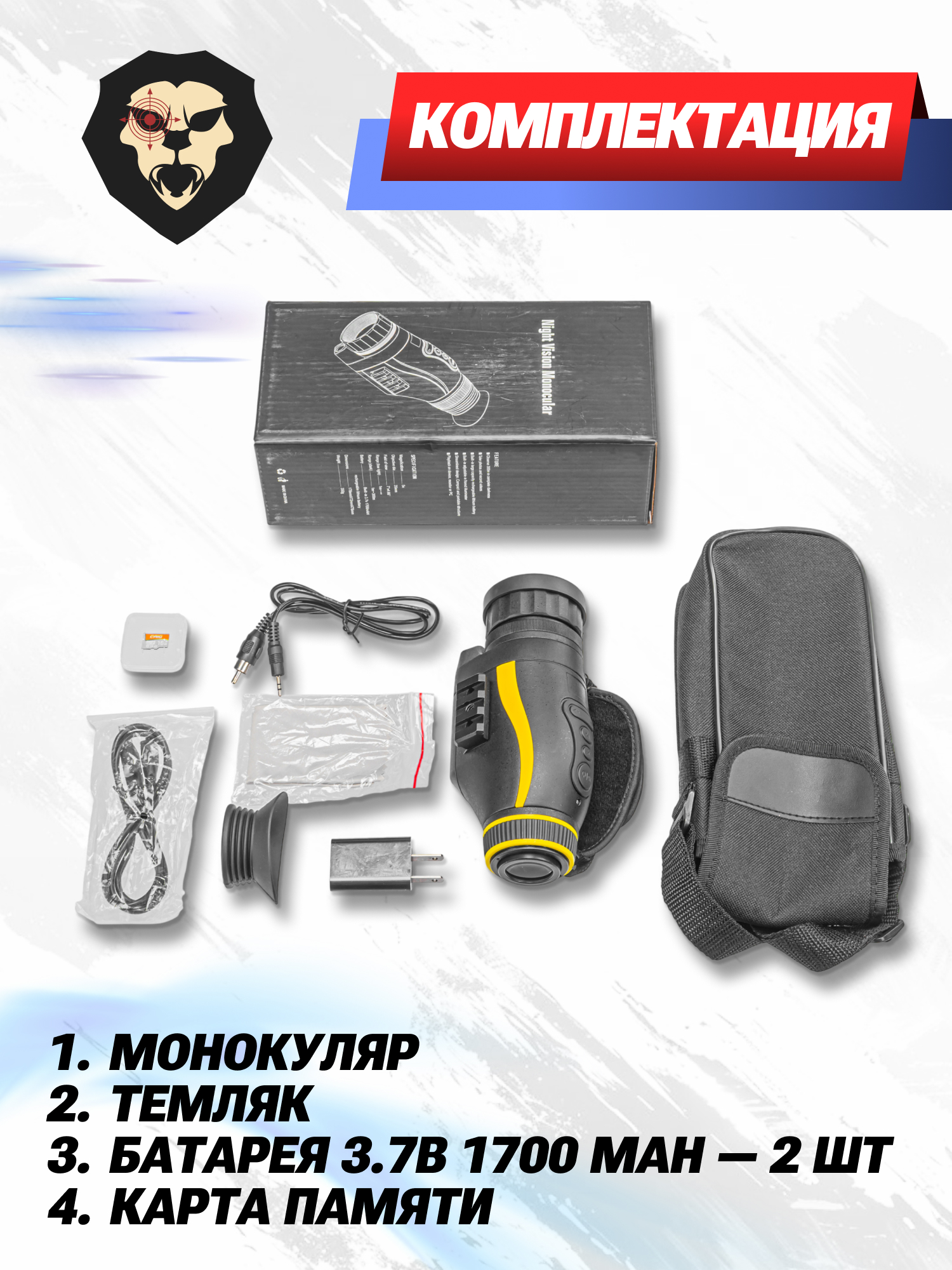 | Комплектация | Монокуляр, темляк, батарея 3.7В 1700 mAh — 2 шт, MicroSD 16 Gb, AV кабель (тюльпан), кабель зарядки micro-USB, зарядный блок, краткая документация, упаковка |