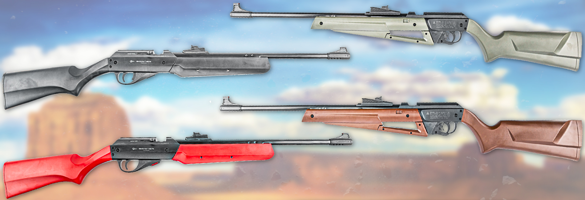 Производитель предлагает винтовки в 4-х цветовых исполнениях - черном, коричневом, красном и зеленом. Первый вариант классический, придающий оружию серьезный вид. Второй выполнили для любителей деревянной фурнитуры, а третий имеет нарочито яркий облик для повышения заметности - такую модель нетрудно отыскать в траве, а при использовании в общественном тире становится сразу понятно, что изделие не боевое. Последний вариант, наоборот, призван размыть силуэт образца на фоне леса.
