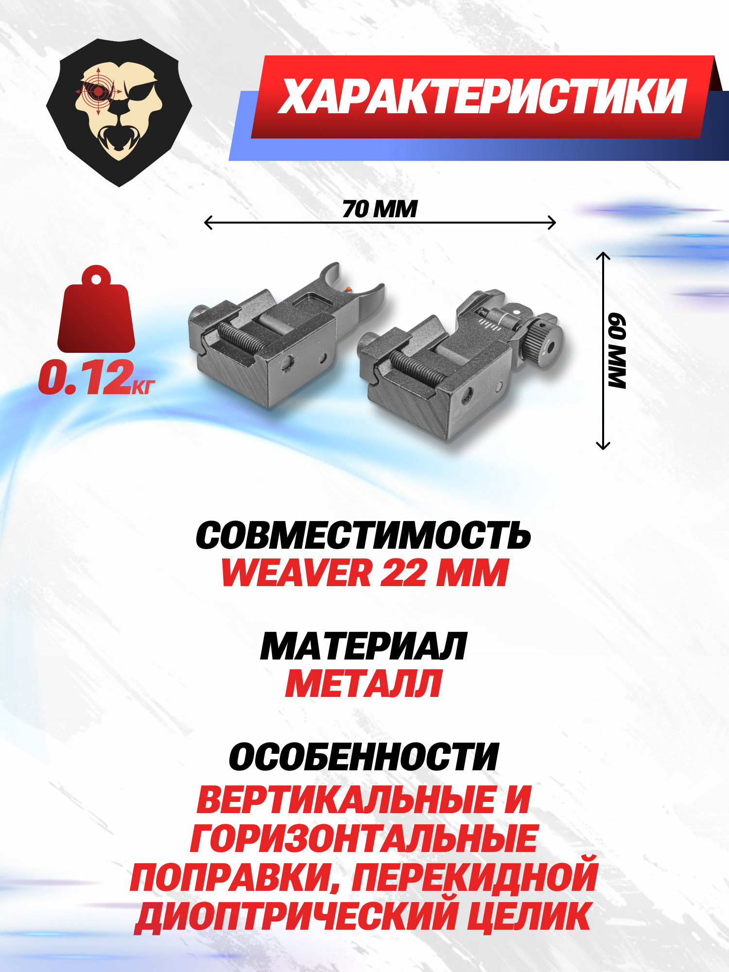 Целик и мушка на карабин Patriot предполагают посадку на стандартный Вивер с шириной в 22 мм. Изделия фиксируют затягиванием винтов под шестигранный ключ. Указанный инструмент присутствует в наборе.