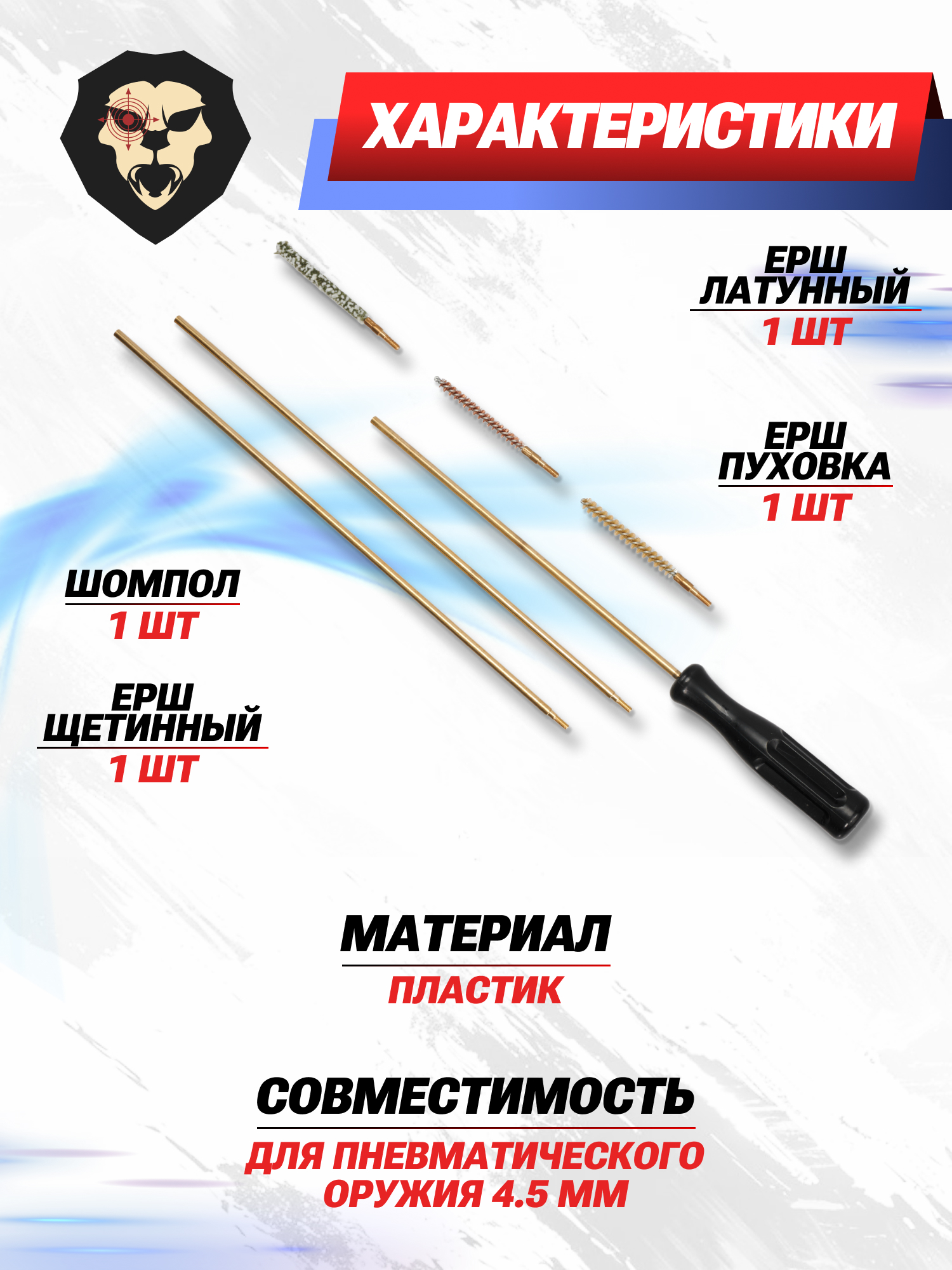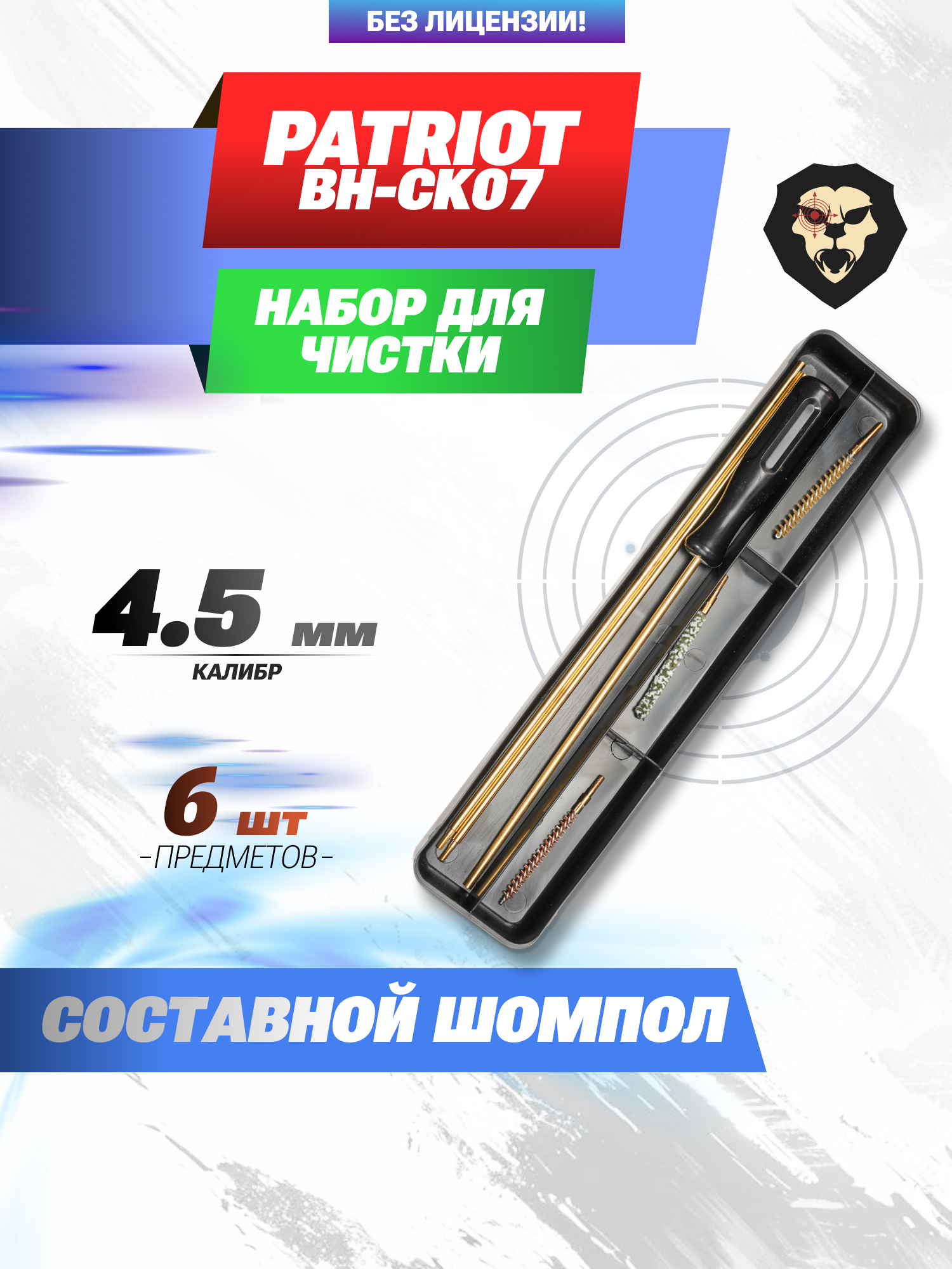 Российская компания Патриот выпустила набор для чистки оружия 4.5 мм. Комплект включает в себя разборный шомпол из двух соединяющихся частей. На него устанавливаются три типа насадок, представленных в составе набора.