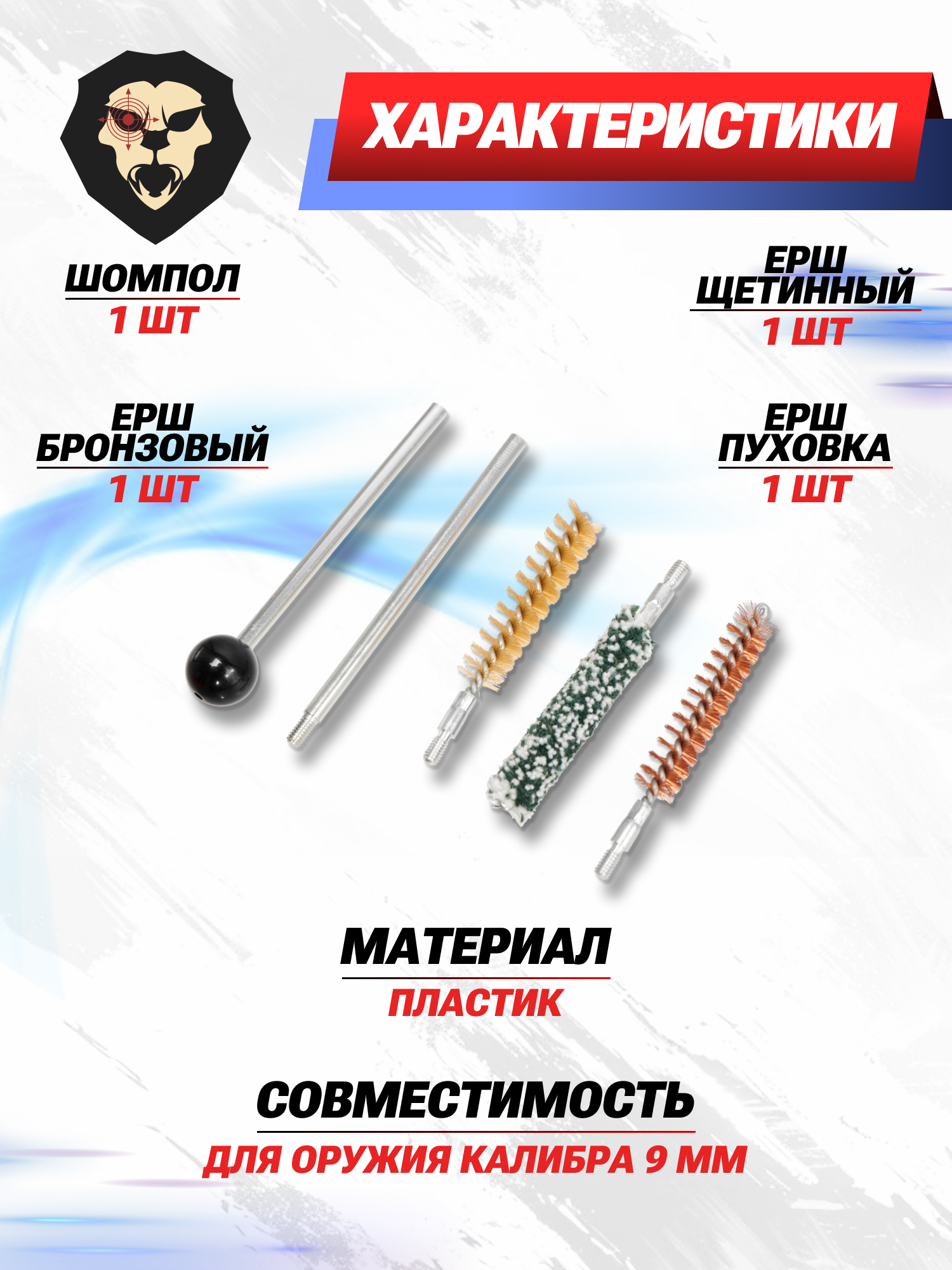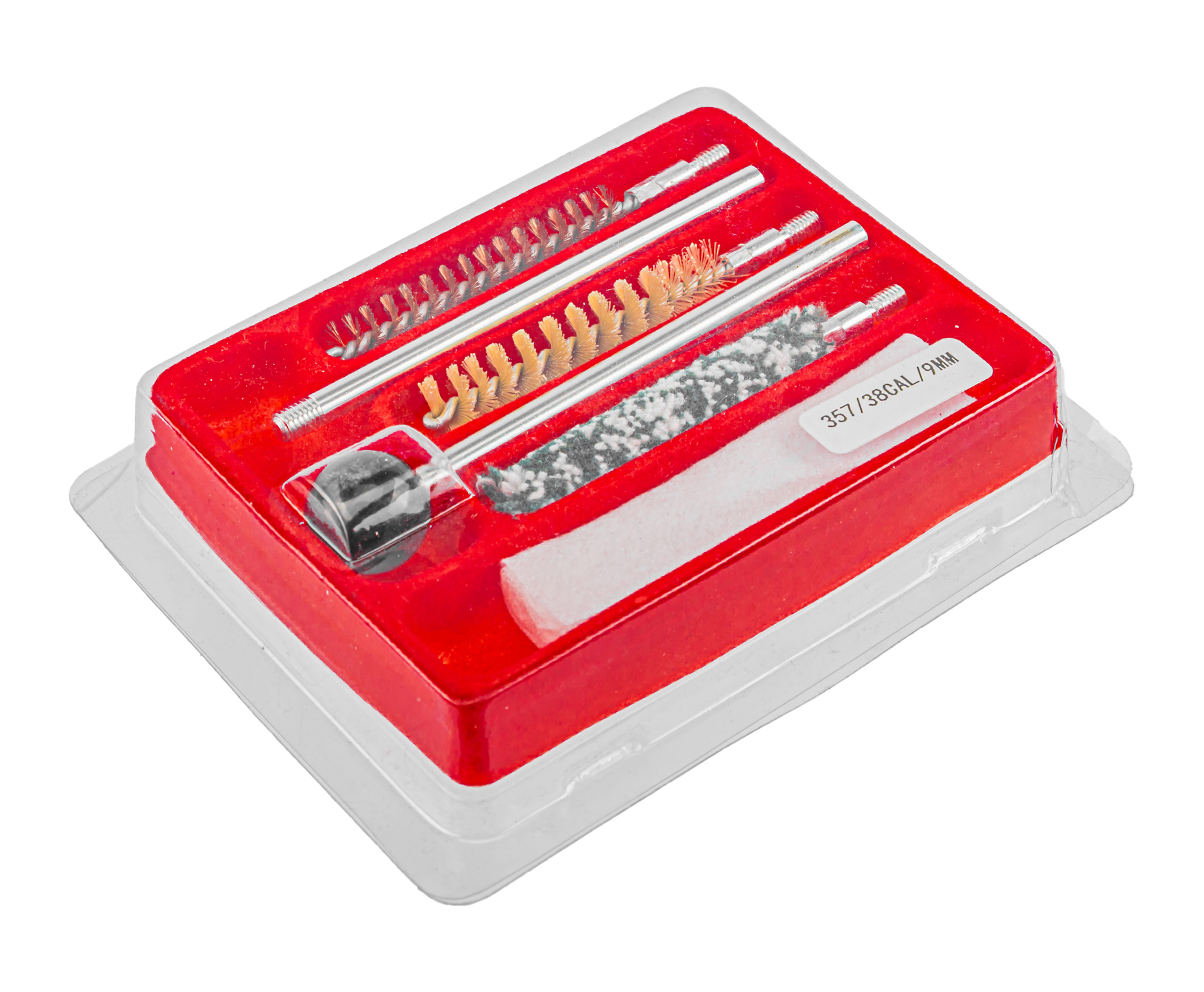 В комплекте идет разборный шомпол длиной 146 миллиметров, для поэтапного обслуживания ствола имеются насадки из трех видов ершей: спиральный из бронзы, пластиковый щетинный, пуховка. Составляющие уложены в отведенные отсеки кейса. Футляр из прочного полимера окрашен в приятный красный цвет, а его вес не превышает 0.3 килограмма, так что он не будет утяжелять стрелка.