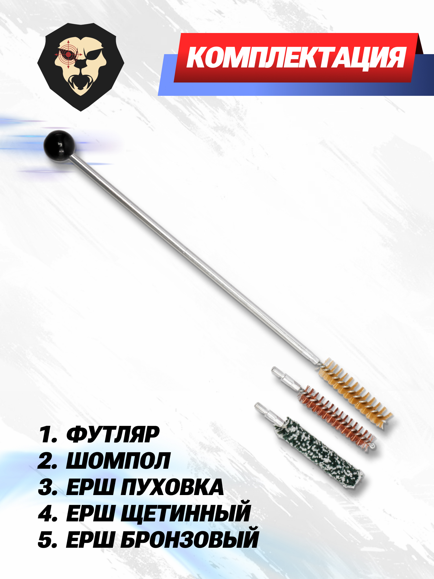 | Комплектация | Красный футляр, шомпол, ерш пуховка, ерш спиральный бронзовый, ерш щетинный (пластик), вишер, упаковка |