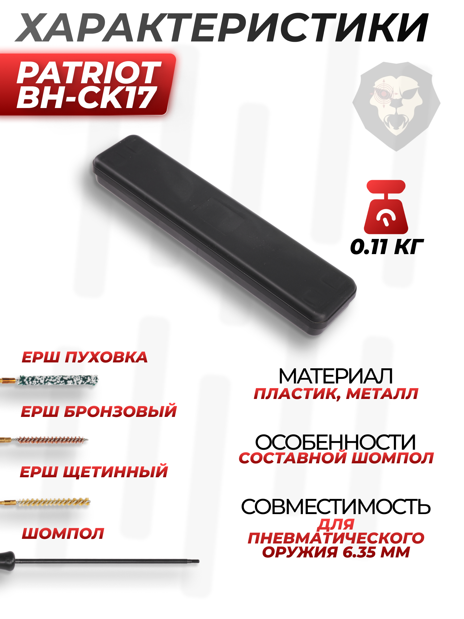 Бренд Patriot не только поставляет модификации оружия, но и аксессуары для ухода за ним. Новым словом в этой отросли стал набор для чистки пневматики 6.35 мм BH-CK17, содержащийся в черном кейсе из прочного полимера с ячейками для каждой части комплекта.