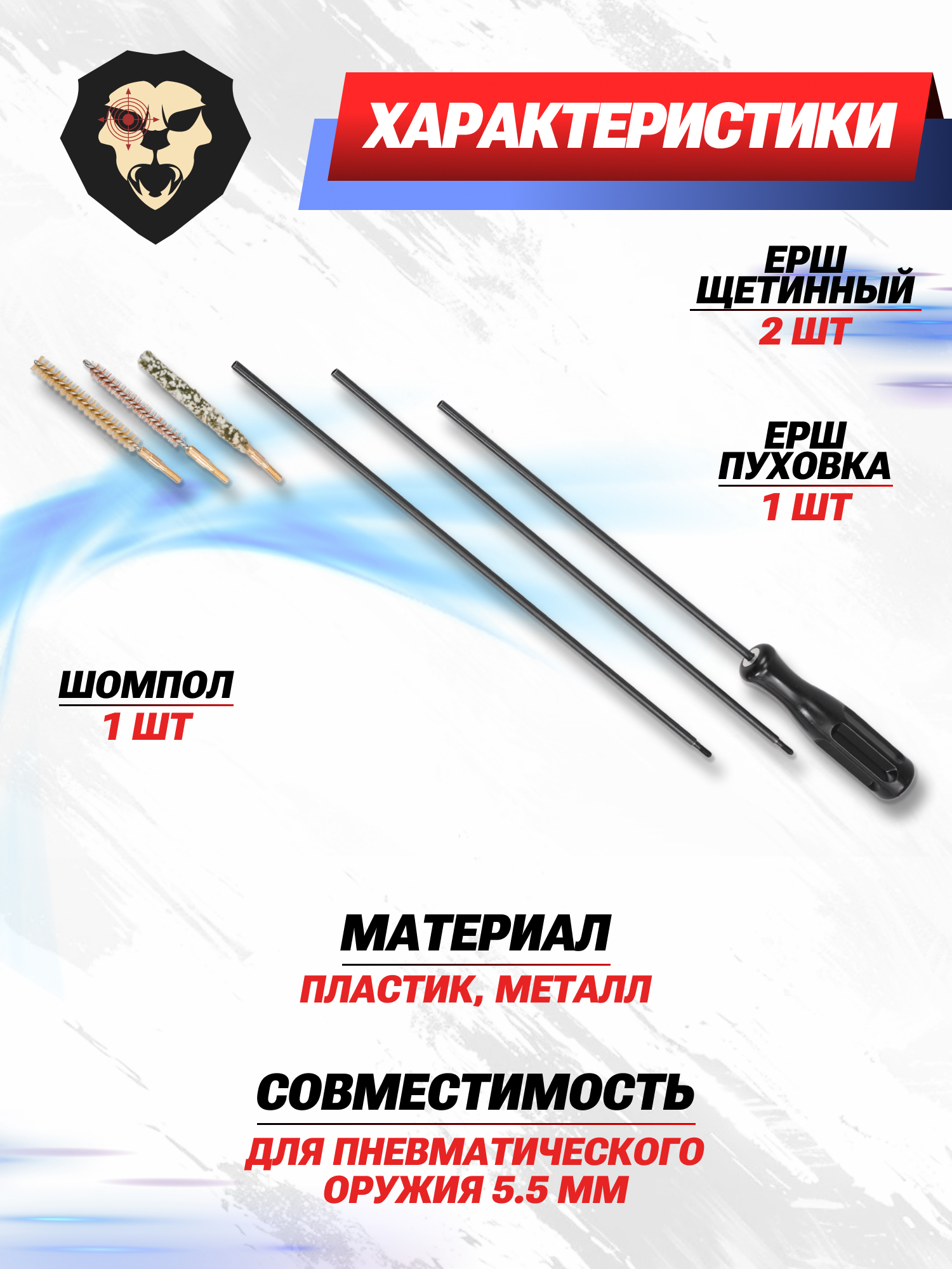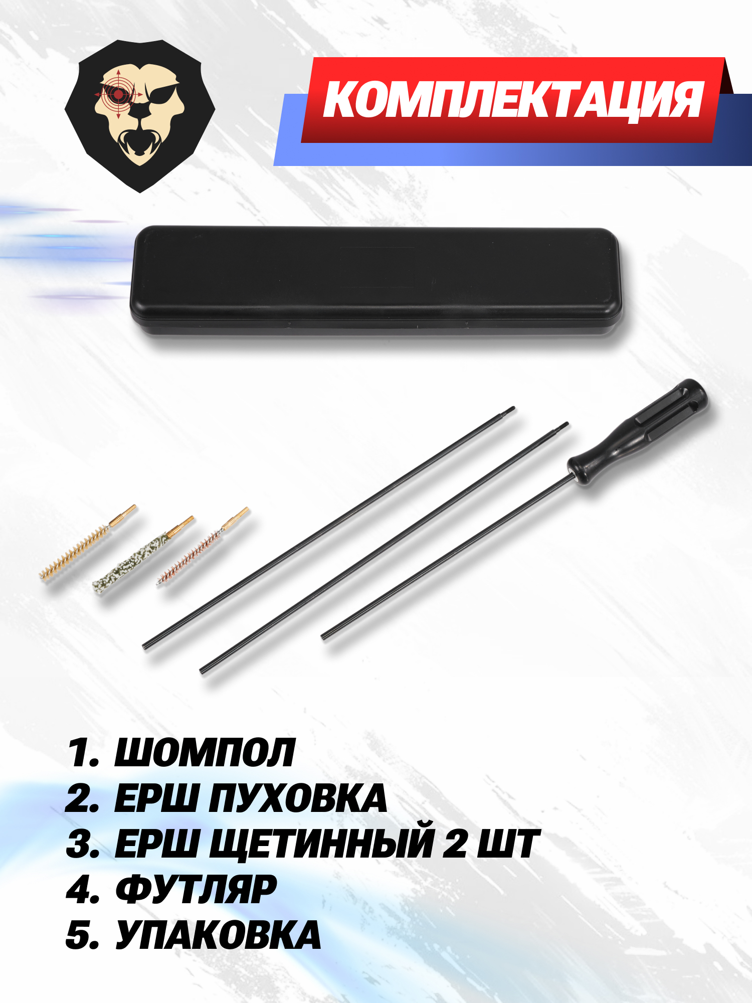 | Комплектация | Шомпол, ерш пуховка, ерш щетинный - 2 шт, упаковка |