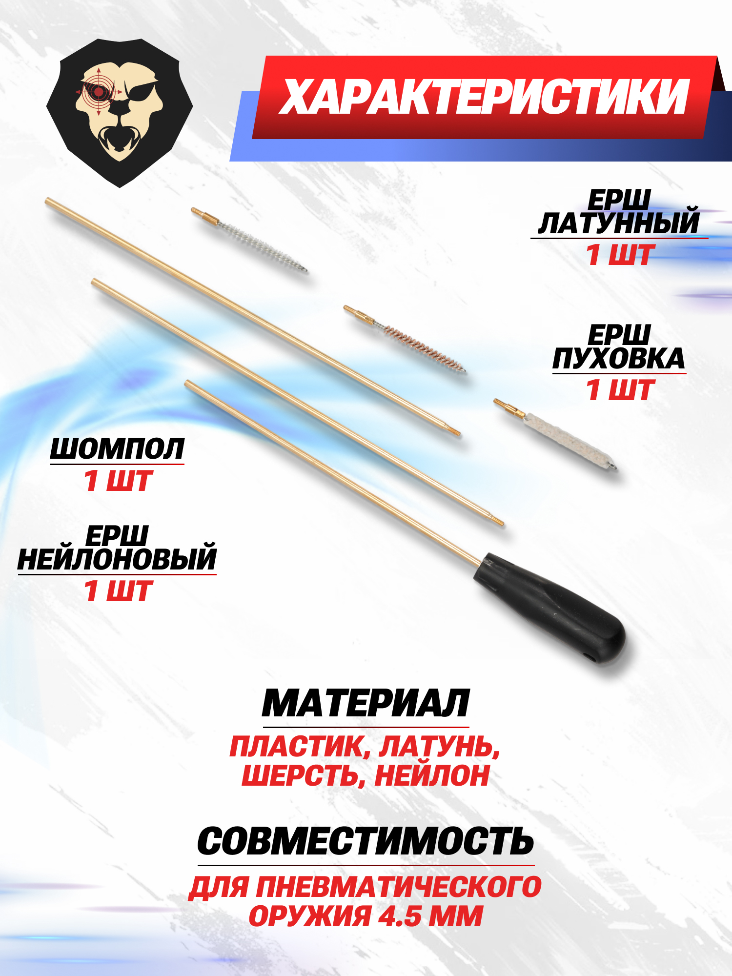 | Особенности | Составной шомпол, три ерша - шерстяной, нейлоновый, латунный |