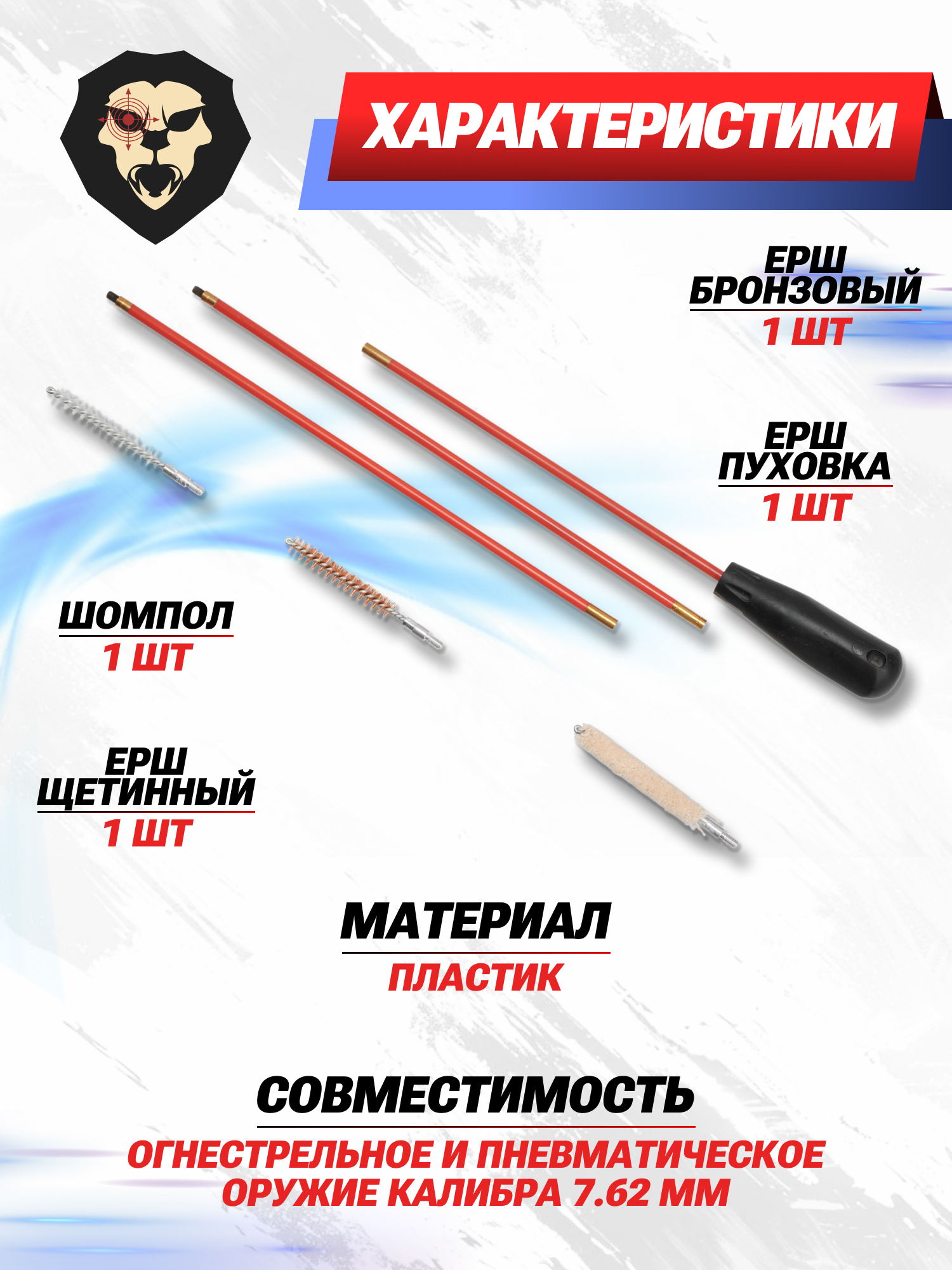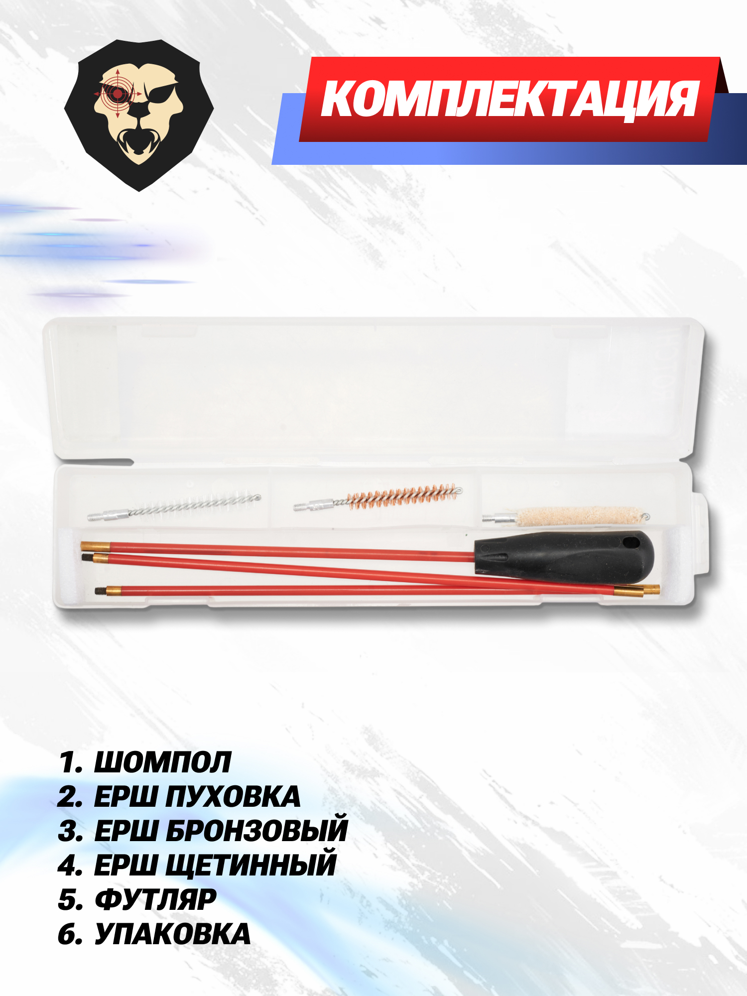 | Комплектация | Пластиковый футляр, шомпол разборный, ерш-пуховка, щетинный ерш, металлический щетинный ерш, упаковка |