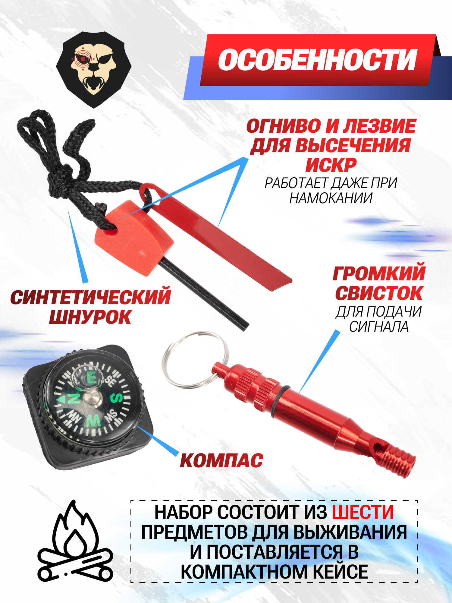 Во главе комплекта стоит мультитул, включающий в себя еще 6 опций: фонарь, пассатижи, две отвертки, открышку и полотно ножа. Также здесь есть компас для ориентирования на местности и свисток — для привлечения внимания спасателей.