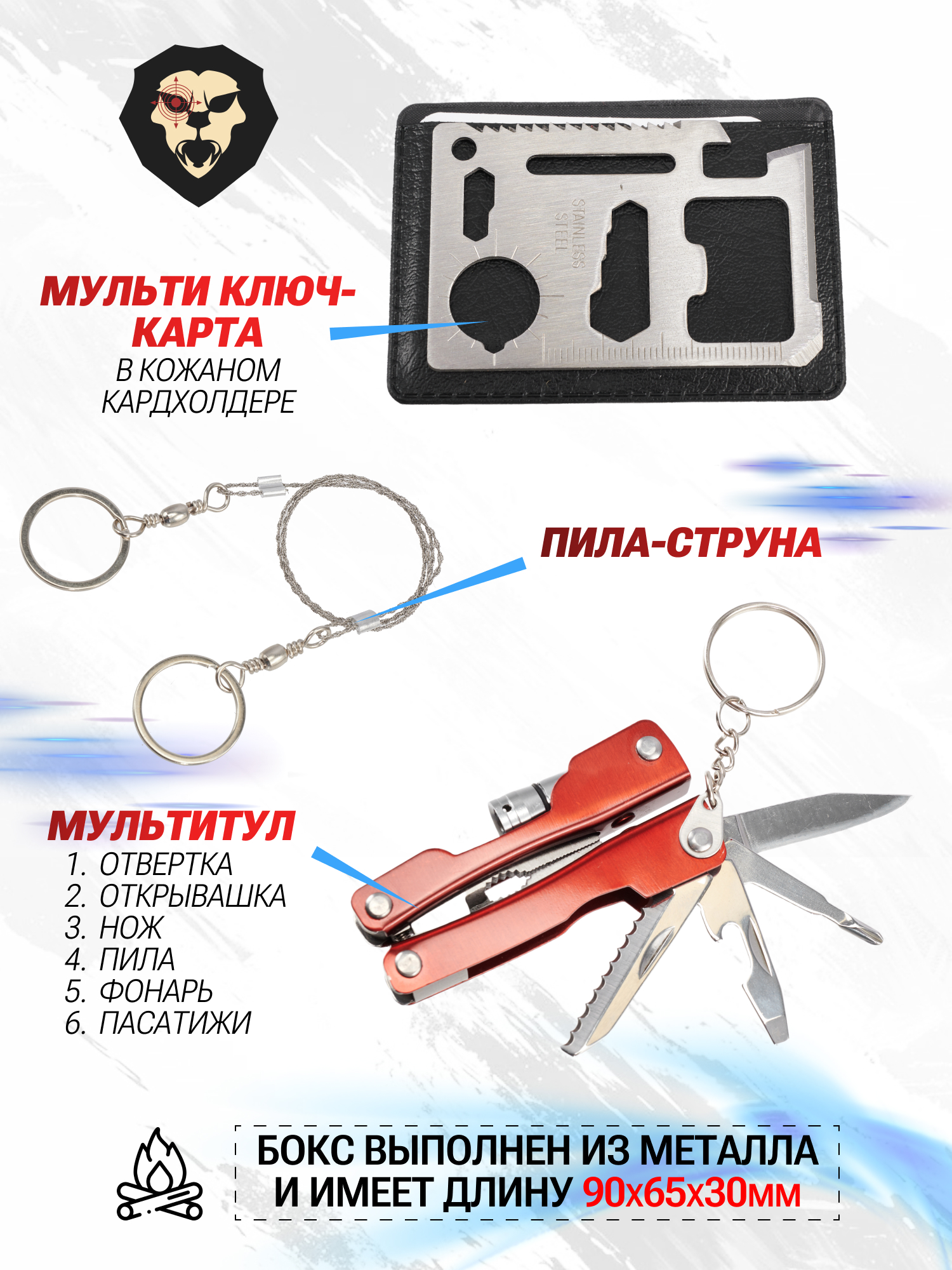 | Комплектация | Бокс, мультитул, пила, мультикарта, свисток, огниво, компас, фонарь, упаковка |
