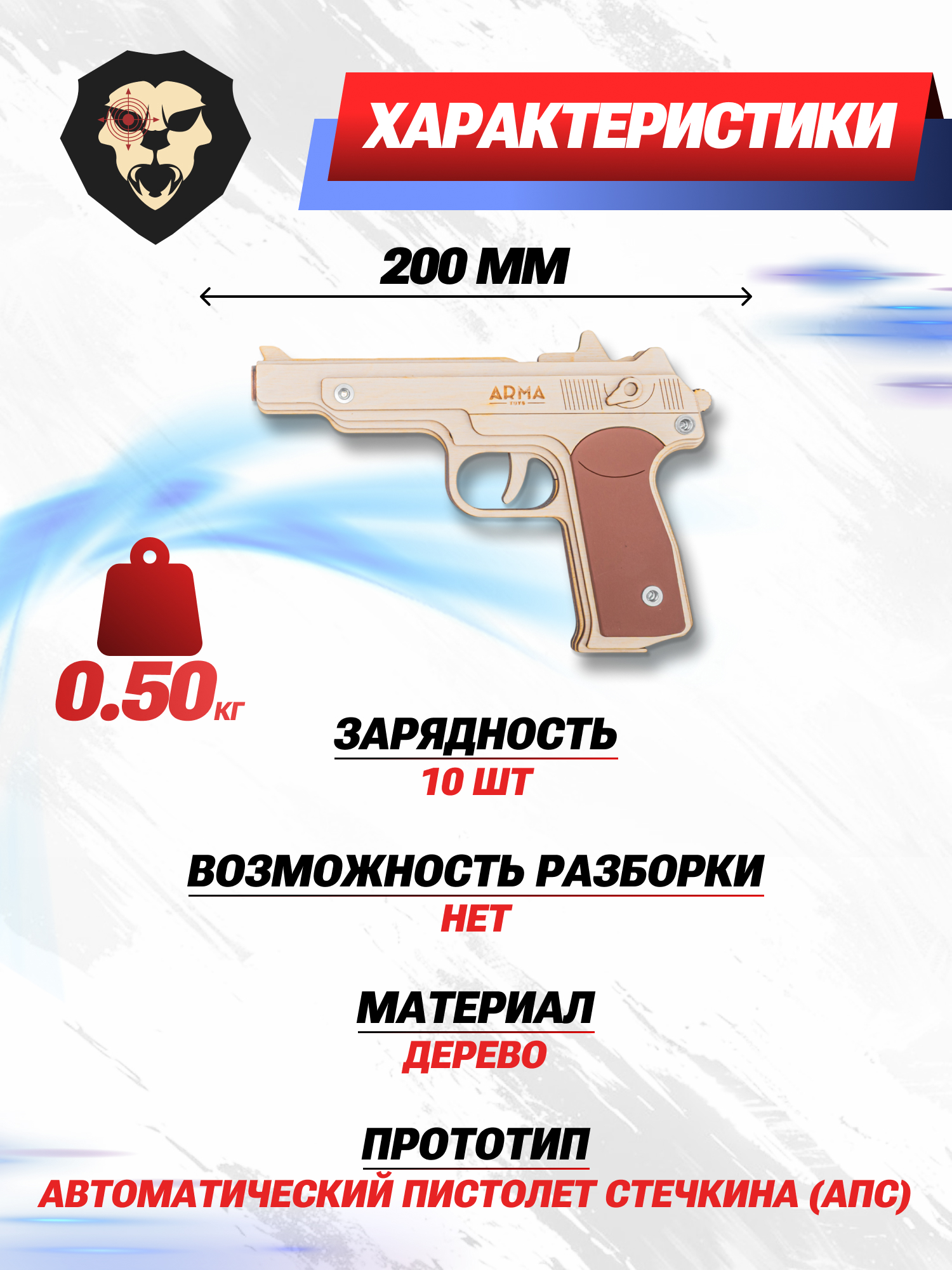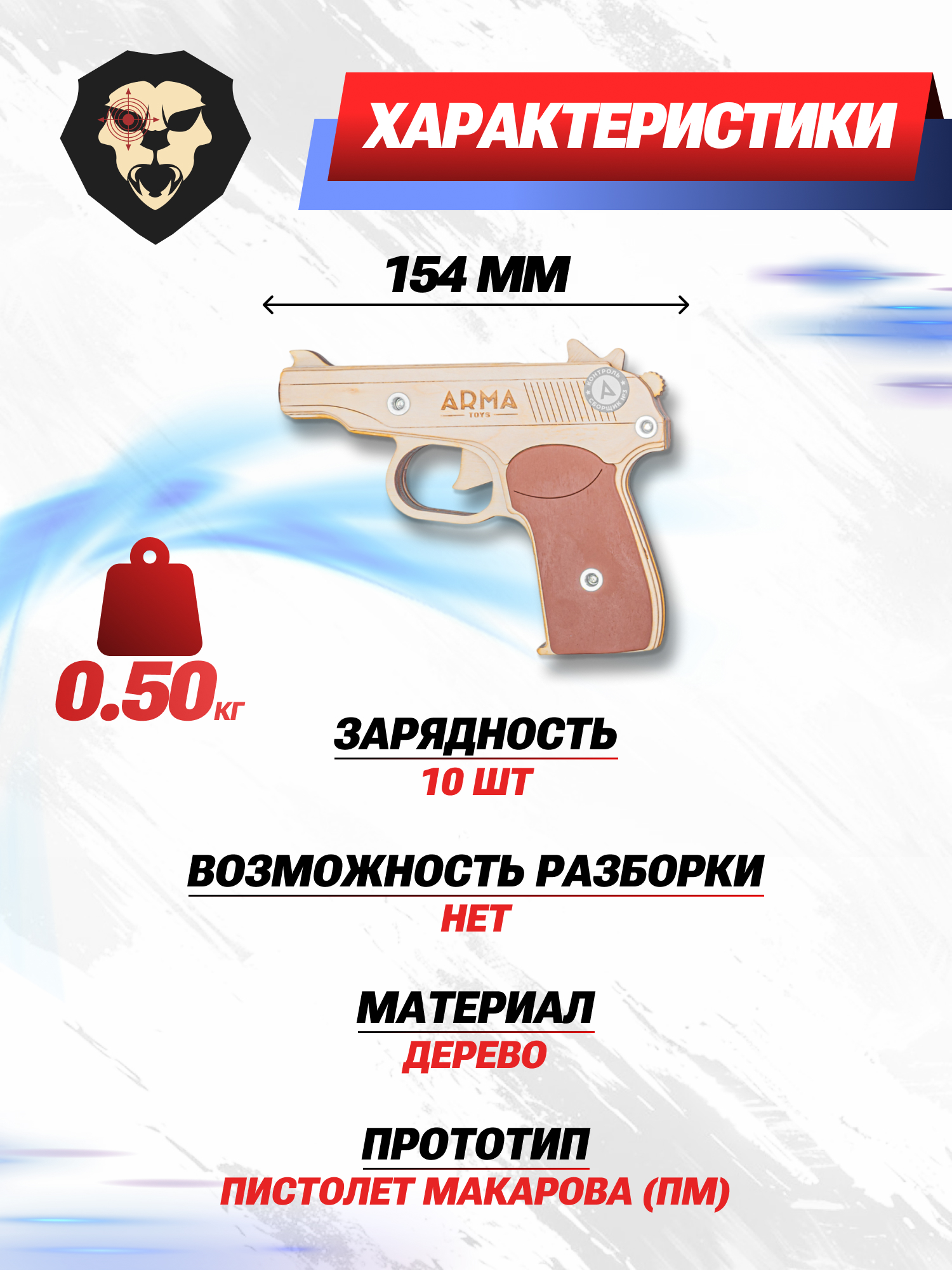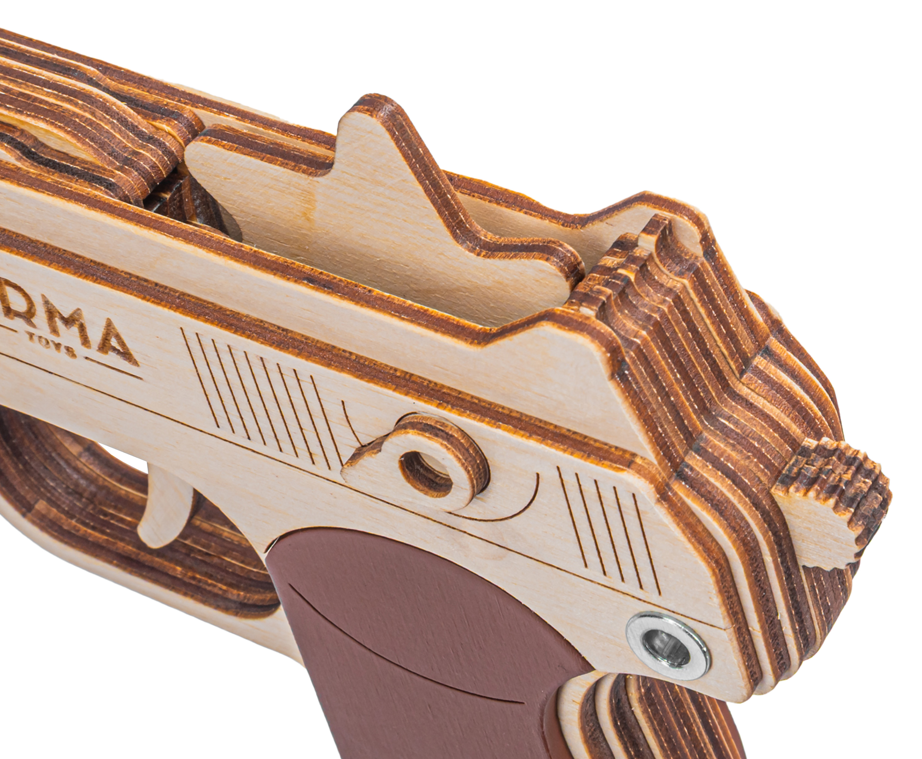 Оба макета с точностью копируют элементы конструкции боевых прототипов, однако габариты изделий подогнаны под удобное удержание ребенком, ввиду чего длина ПМ и АПС составляет 154 и 200 мм соответственно. Резинкометы поставляются в деревянном коробе, а в комплект включены мишени и метаемые жгуты специального диаметра, помимо которых также подойдут и классические канцелярские резинки.