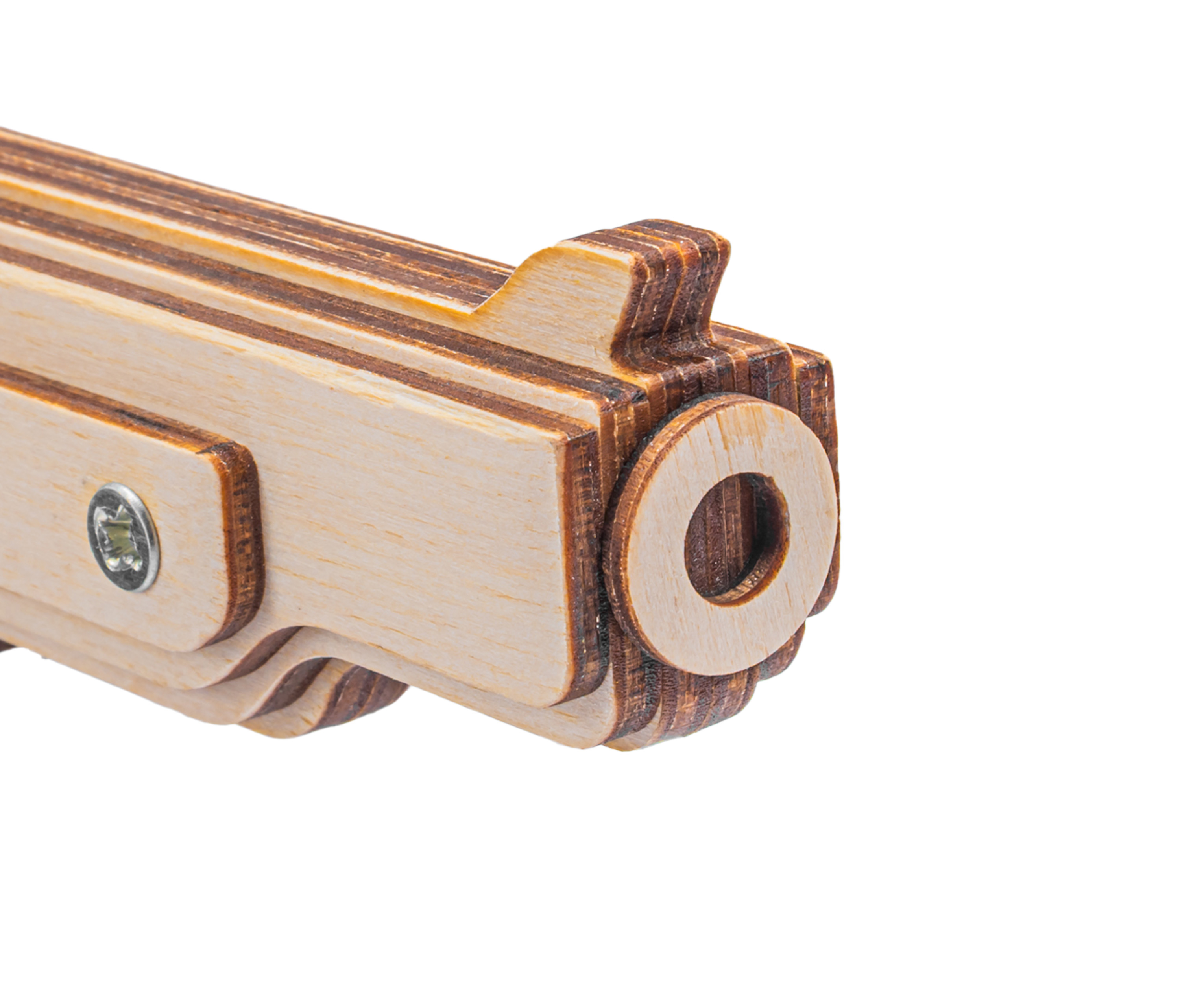 Снаряды не способны навредить здоровью, а благодаря нетоксичным природным материалам макеты не вызывают аллергии и подойдут ребенку любого возраста. Фанера из экологичного древесного сырья первого сорта проходит через процедуру шлифовки во избежание получения заноз, а для повышения прочностных характеристик детали соединяются дополнительными крепежными элементами из нержавеющего металла.