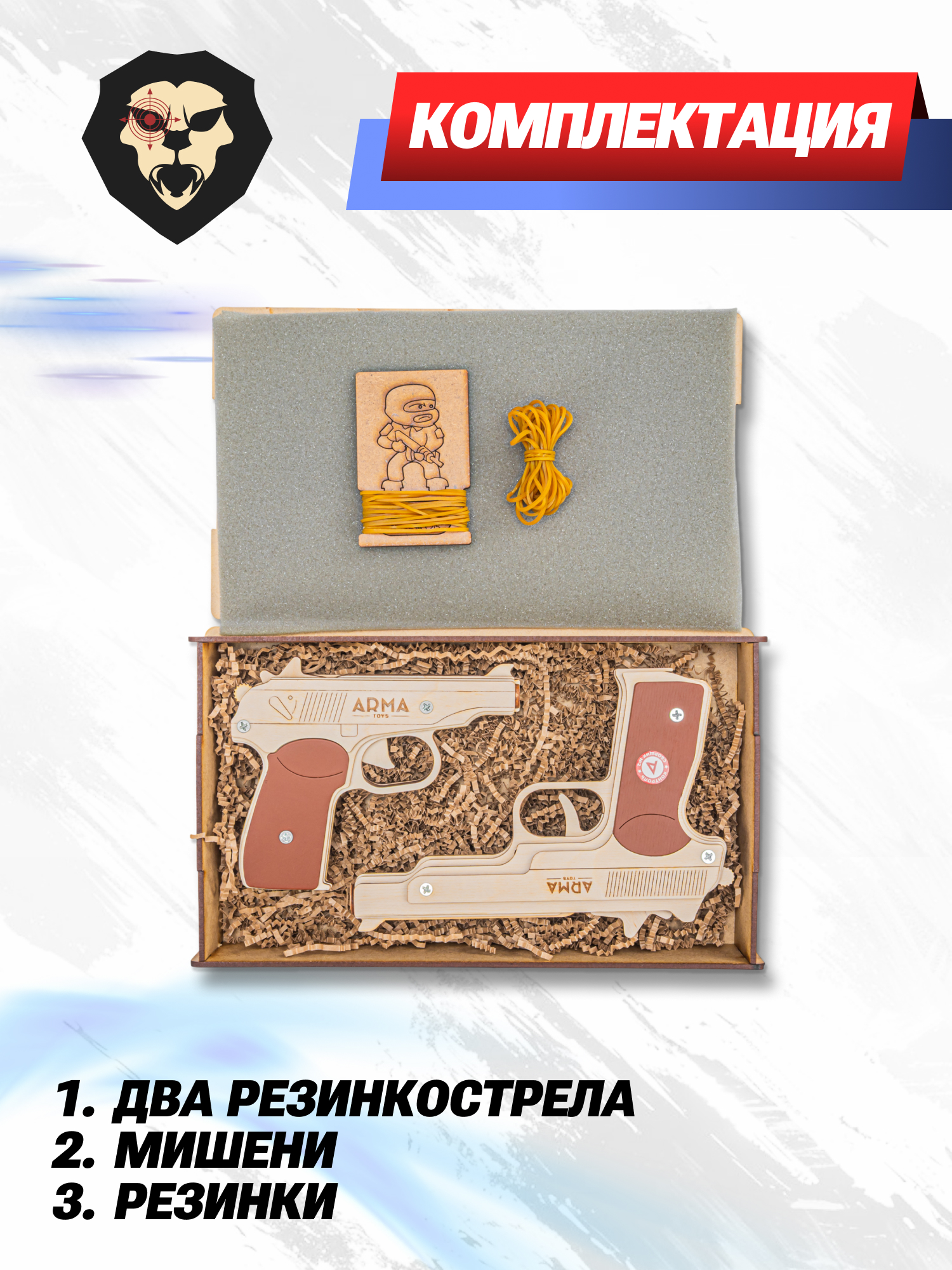 | Особенности | Мишень и резинки в комплекте |