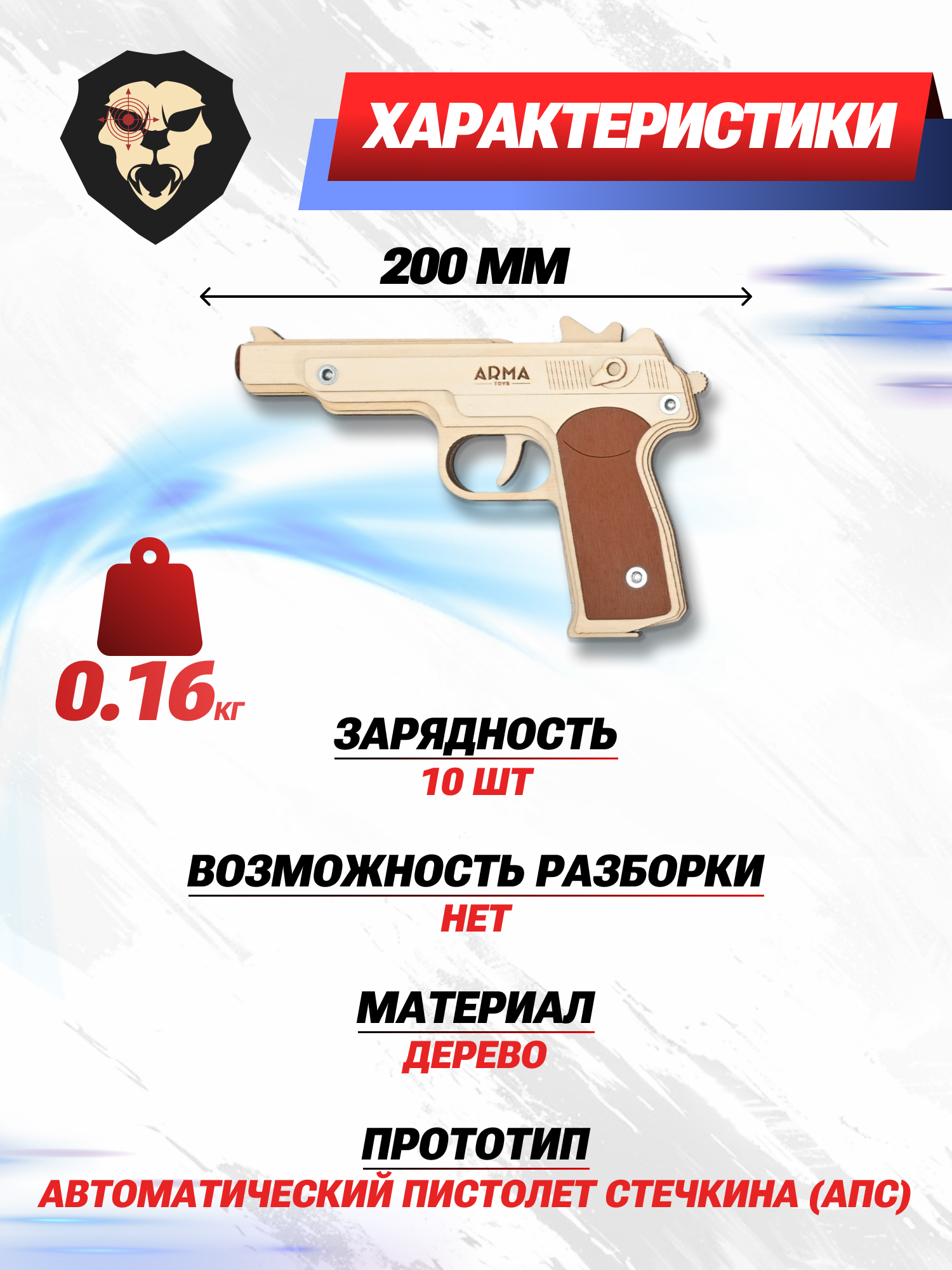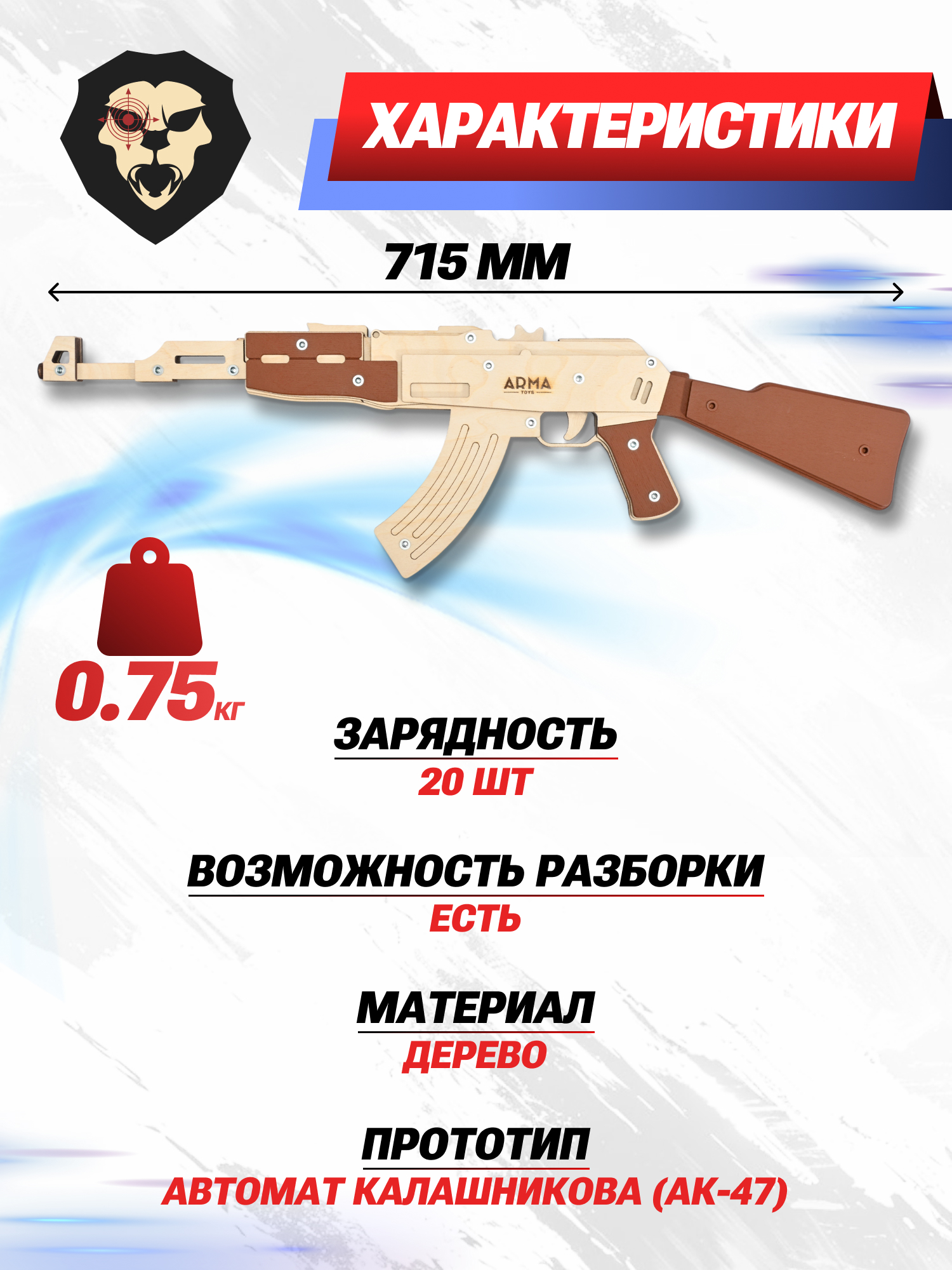 Макеты, как и прочая продукция фирмы, изготавливаются с применением экологичного материала - натуральной древесины в виде дощечек фанеры. Составные детали вырезаются посредством точного лазера на специальном станке, а во время сборки используется нержавеющий металлический крепеж. Резинкометы АК-47 и АПС, по сравнению с оригинальными прототипами, характеризуются уменьшенными габаритами - 71.5 и 20 см в длину соответственно, что сделано специально для удобства удержания ребенком любого возраста.