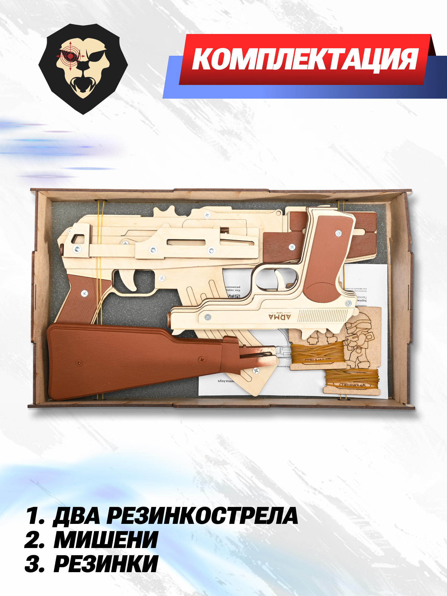 Помимо одиночных реплик, компания также выпускает тематические комплекты из нескольких изделий. Представленный набор резинкострелов «Военный специалист» включает в себя два знаменитых образца Советской оружейной промышленности - автомат Калашникова и пистолет Стечкина. Боевые прототипы в модернизированном варианте до сих пор используются армейскими подразделениями нашей страны и ценятся по всему миру за неприхотливость и надежность.