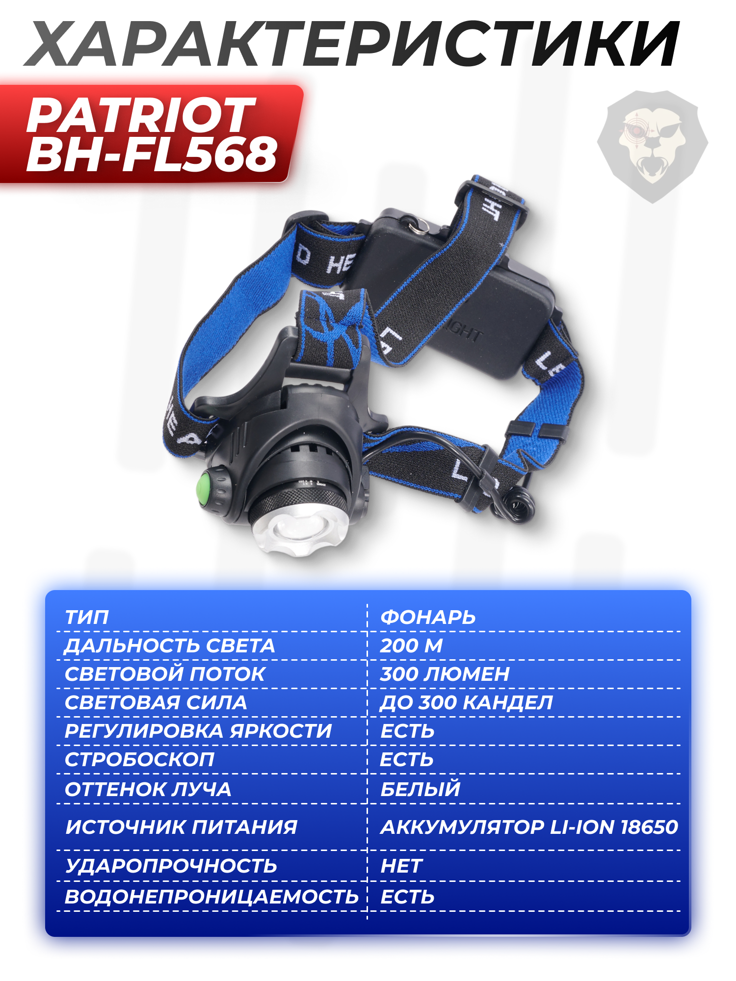 Налобный фонарь Patriot BH-FL568 (3 режима, зум) купить в интернет-магазине Popadiv10.